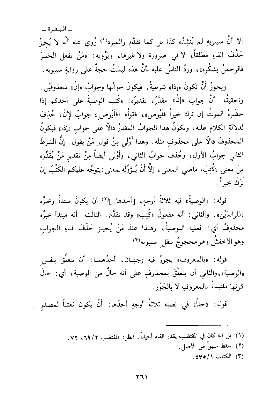 قوله: {الوصية} فيه ثلاثةُ أوجهٍ، [أحدها:] أن يكون مبتدأً وخبرُه» للوالدَيْن «. والثاني: أنه مفعولُ» كُتِب «وقد تقدَّم. الثالث: أنه مبتدأ خبرُه محذوفٌ أي: فعليه الوصيةُ، وهذا عندَ مَنْ يُجيز حَذْفَ فاءِ الجوابِ وهو الأخفشُ وهو محجوجٌ بنقلِ سيبويه.