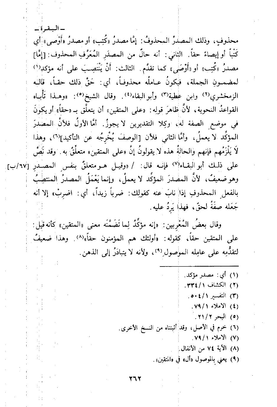محذوفٍ، وذلك المصدرُ المحذوفُ: إمَّا مصدرُ «كُتِب» أو مصدرُ «أَوْصى» أي كَتْباً أو إيصاءً حقاً. الثاني: أنه حالٌ من المصدَرِ المُعَرَّفِ المحذوف: [إِمَّا] مصدرُ «كُتِب» أو «أَوْصَى» كما تقدَّم. الثالث: أَنْ يَنْتَصِبَ على أنه مؤكد لمضمونِ الجملة، فيكونُ عاملُه محذوفاً، أي: حَقَّ ذلك حقاً، قاله الزمخشري وابن عطية وأبو البقاء. وقال الشيخ: «وهذا تَأْباه القواعدُ النحوية، لأنَّ ظاهرَ قولِه:» على المتقين «أن يتعلَّق ب» حقاً «أو يكونَ في موضعِ الصفة له، وكِلا التقديرين لا يجوزُ. أمَّا الأولُ فلأنَّ المصدرَ المؤكِّد لا يعملُ، وأمَّا الثاني فلأن [الوصفَ يُخْرِجُه عن التأكيد] ، وهذا لاَ يَلْزَمُهم فإنهم والحالةُ هذه لا يقولونُ إنَّ» على المتقين «متعلِّقٌ به. وقد نَصَّ على ذلك أبو البقاء فإنه قال: /» وقيل هو متعلقٌ بنفسِ المصدرِ وهو ضعيفٌ، لأنَّ المصدرَ المؤكِّد لا يعملُ، وإنما يَعْمَلُ المصدرُ المنتصِبُ بالفعلِ المحذوفِ إذ نابَ عنه كقولِك: ضرباً زيداً، أي: اضرِبْ «إلا أنه جَعَله صفَةً لحقّ، فهذا يَرِدُ عليه.