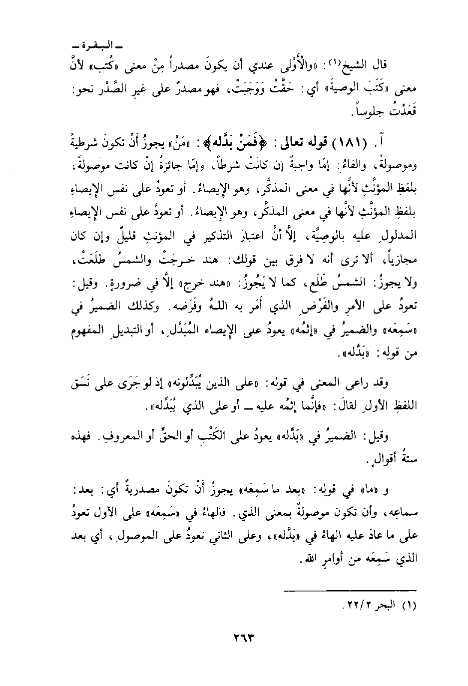 قوله تعالى: {فَمَن بَدَّلَهُ} : «مَنْ» يجوزُ أَنْ تكونَ شرطيةً وموصولةً، والفاءُ: إمّا واجبةٌ إن كانَتْ شرطاً، وإمّا جائزٌ إنْ كانت موصولةً، بلفظِ المؤنَّثِ لأنَّها في معنى المذكَّر، وهو الإِيصاءُ. أو تعود على نفس الإِيصاء المدلولِ عليه بالوصِيَّة، إلاَّ أنَّ اعتبارَ التذكير في المؤنثِ قليلٌ وإن كان مجازياً، ألا ترى أنه لا فرق بين قولك: هند خرجَتْ والشمسُ طلَعَتْ، ولا يجوزُ: الشمسُ طَلَع، كما لا يَجُوزُ: «هند خرج» إلاَّ في ضرورةٍ. وقيل: تعودُ على الأمرِ والفَرْضِ الذي أَمَرَ به اللهُ وفَرَضه. وكذلك الضميرُ في «سَمِعَه» والضميرُ في «إثمُه» يعودُ على الإِيصاء المُبَدَّلِ، أو التبديلِ المفهوم من قولِه: «بَدَّله» .