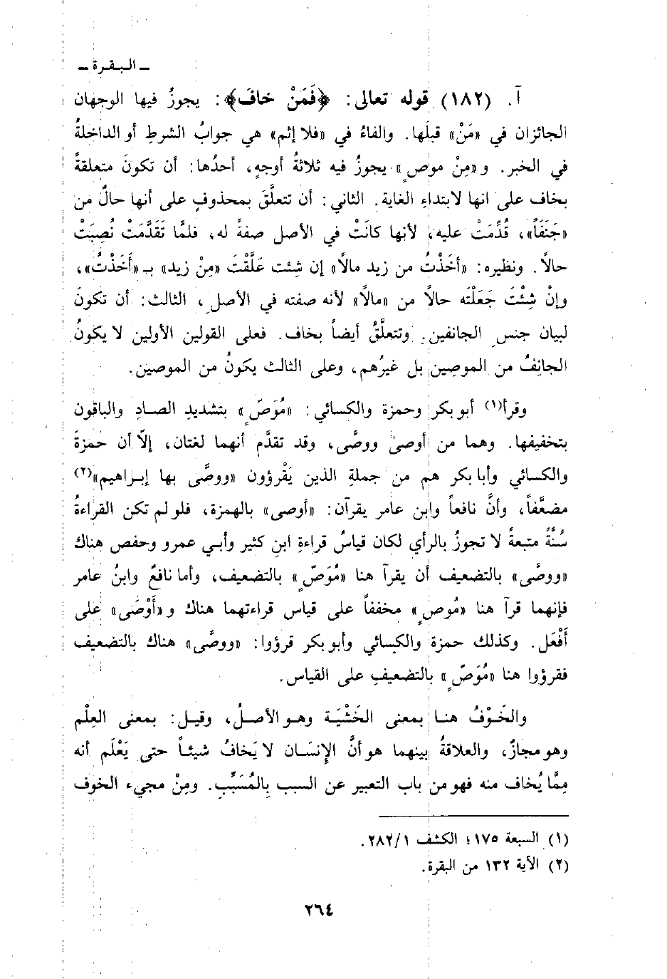 قوله تعالى: {فَمَنْ خَافَ} : يجوزُ فيها الوجهان الجائزان في «مَنْ» قبلَها. والفاءُ في «فلا إثم» هي جوابُ الشرطِ أو الداخلةُ في الخبر. و «مِنْ موصٍ» يجوزُ فيه ثلاثةُ أوجهٍ، أحدُها: أن تكونَ متعلقةً بخاف على انها لابتداءِ الغاية. الثاني: أن تتعلَّقَ بمحذوفٍ على أنها حالٌ من «جَنَفَاً» ، قُدِّمَتْ عليه، لأنها كانَتْ في الأصل صفةً له، فلمَّا تَقَدَّمَتْ نُصِبَتْ حالاً. ونظيره: «أخَذْتُ من زيد مالاً» إن شِئت عَلَّقْتُ «مِنْ زيد» ب «أَخَذْتُ» ، وإنْ شِئْتَ جَعَلْتَه حالاً من «مالاً» لأنه صفته في الأصلِ، الثالث: أن تكونَ لبيان جنسِ الجانفين: وتتعلَّقُ أيضاً بخاف. فعلى القولين الأولين لا يكونَ الجانِفُ من الموصِين بل غيرُهم، وعلى الثالث يكونُ من الموصين.