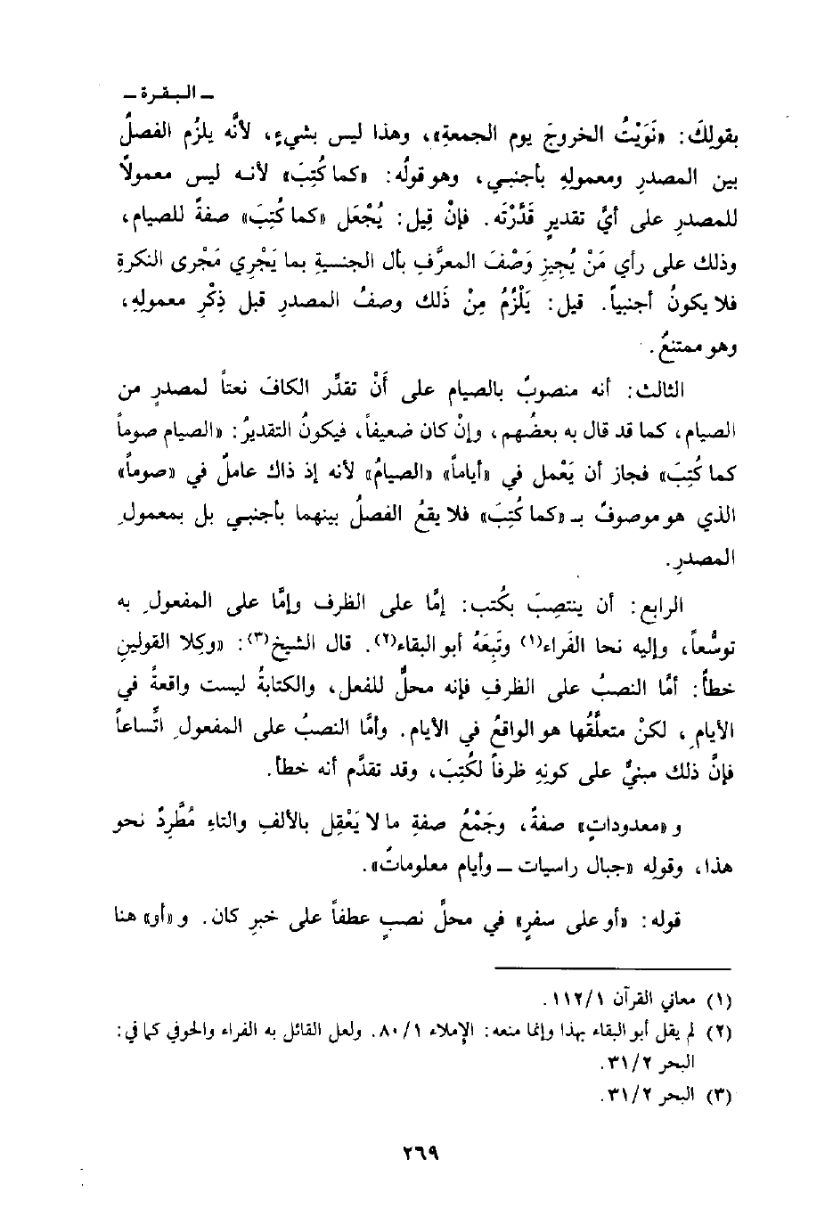 بقولِكَ: «نَوَيْتُ الخروجَ يوم الجمعةِ» ، وهذا ليس بشيءٍ، لأنَّه يلزُم الفصلُ بين المصدرِ ومعمولِهِ بأجنبي، وهو قولُه: «كما كُتِبَ» لأنه ليس معمولاً للمصدرِ على أيَّ تقديرٍ قَدَّرْتَه. فإنْ قِيل: يُجْعَل «كما كُتِبَ» صفةً للصيام، وذلك على رأي مَنْ يُجِيزِ وَصْفَ المعرَّفِ بأل الجنسيةِ بما يَجْرِي مَجْرى النكرةِ فلا يكونُ أجنبياً. قيل: يَلْزُمُ مِنْ ذَلك وصفُ المصدرِ قبل ذِكْرِ معمولِهِ، وهو ممتنعٌ.