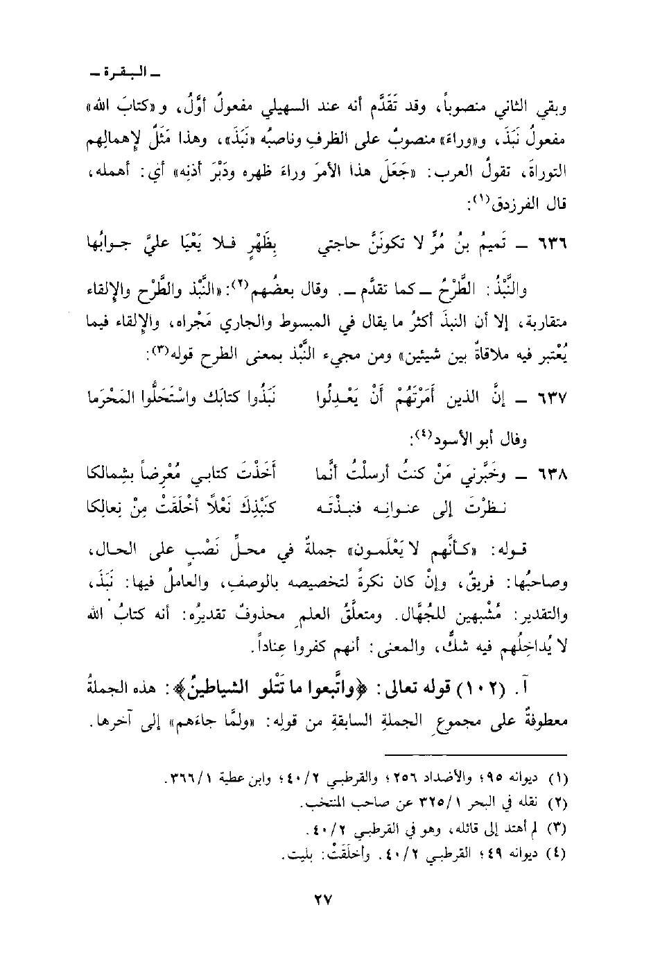 وبقي الثاني منصوباً، وقد تَقَدَّم أنه عند السهيلي مفعولٌ أوَّلُ، و «كتابَ الله» مفعولُ نَبَذَ، و «وراءَ» منصوبٌ على الظرفِ وناصبُه «نَبَذَ» ، وهذا مَثَلٌ لإِهمالِهم التوراةَ، تقولُ العرب: «جَعَلَ هذا الأمرَ وراءَ ظهره ودَبْرَ أذنِه» أي: أهمله، قال الفرزدق: