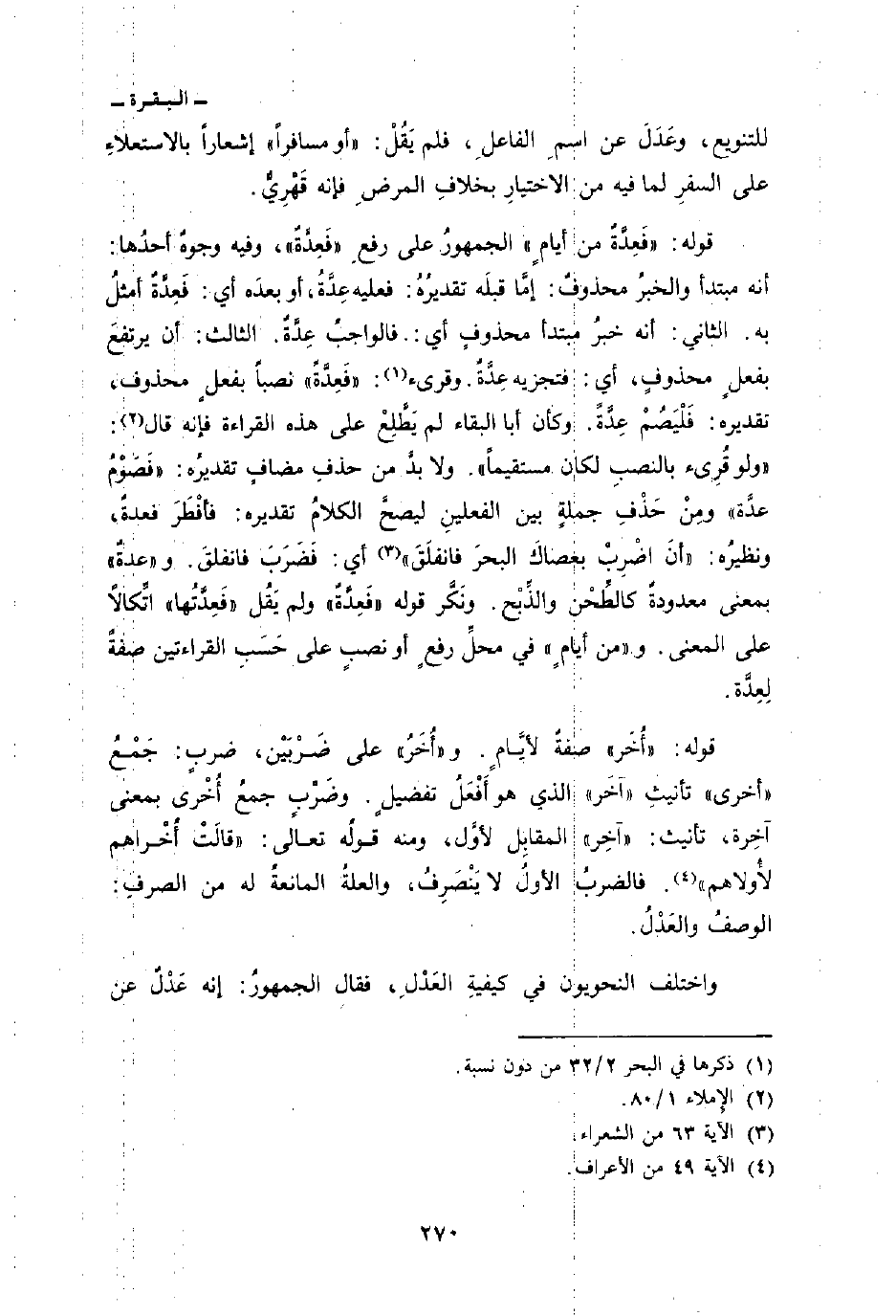 قوله: {أُخَرَ} صفةٌ لأيَّامٍ. و «أُخَرُ» على ضَرْبَيْن، ضربٍ: جَمْعُ «أخرى» تأنيثِ «آخَر» الذي هو أَفْعَلُ تفضيلٍ. وضَرْبٍ جمعُ أُخْرى بمعنى آخِرة، تأنيث: «آخِر» المقابِل لأوَّل، ومنه قولُه تعالى: {قَالَتْ أُخْرَاهُمْ لأُولاَهُمْ} [الأعراف: 49] . فالضربُ الأولُ لا يَنْصَرِفُ، والعلةُ المانعةُ له من الصرفِ: الوصفُ والعَدْلُ.