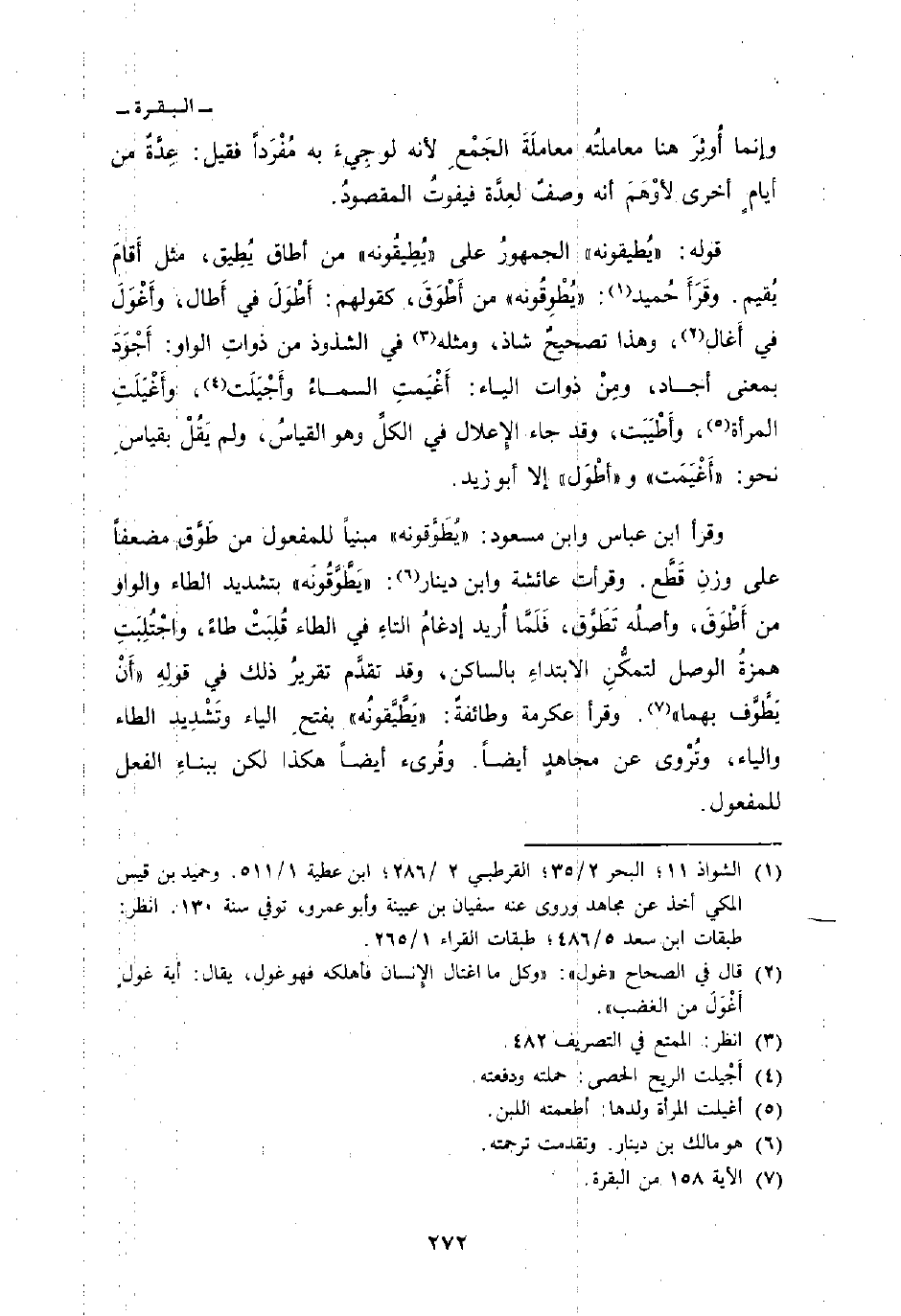 قوله: {يُطِيقُونَهُ} الجمهورُ على «يُطِيقُونه» من أطاق يُطِيق، مثل أَقامَ يُقيم. وقَرَأَ حُميد: «يُطْوِقُونه» من أَطْوقَ، كقولهم: أَطْوَلَ في أَطال، وأَغْوَلَ في أَغال، وهذا تصحيحٌ شاذ، ومثله في الشذوذ من ذواتِ الواو: أَجْوَدَ بمعنى أجاد، ومِنْ ذوات الياء: أَغْيَمتِ السماءُ وأَجْيَلَت، وأَغْيَلَتِ المرأة، وأَطْيَبَت، وقد جاء الإِعلال في الكلِ وهو القياسُ، ولم يَقُلْ بقياسِ نحو: «أَغْيَمَت» و «أطْوَل» إلا أبو زيد.