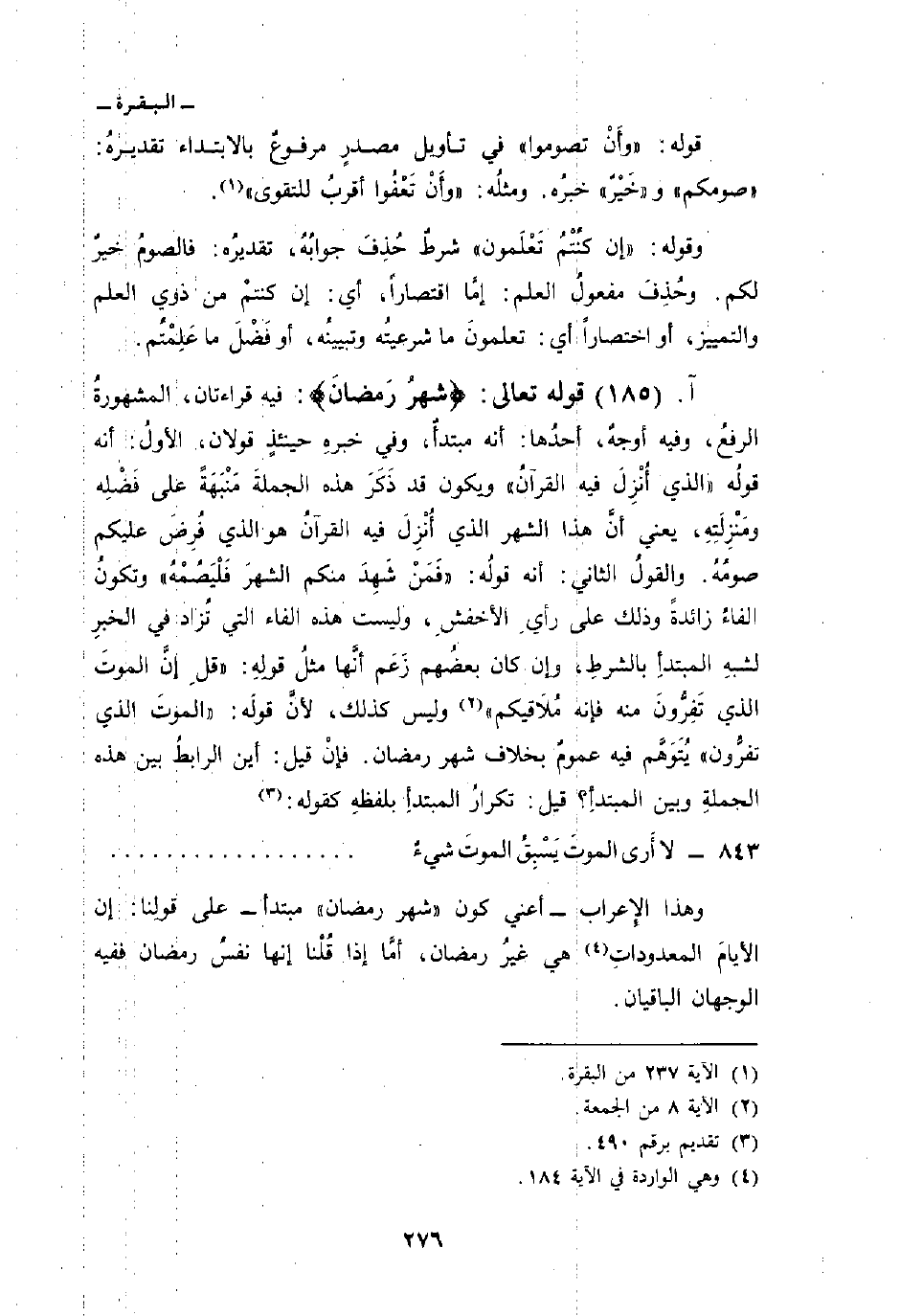 وهذا الإِعراب - أعني كون «شهر رمضان» مبتدأ - على قولِنا: إن الأيامَ المعدوداتِ هي غيرُ رمضان، أمَّا إذا قُلْنا إنها نفسُ رمضان ففيه الوجهان الباقيان.