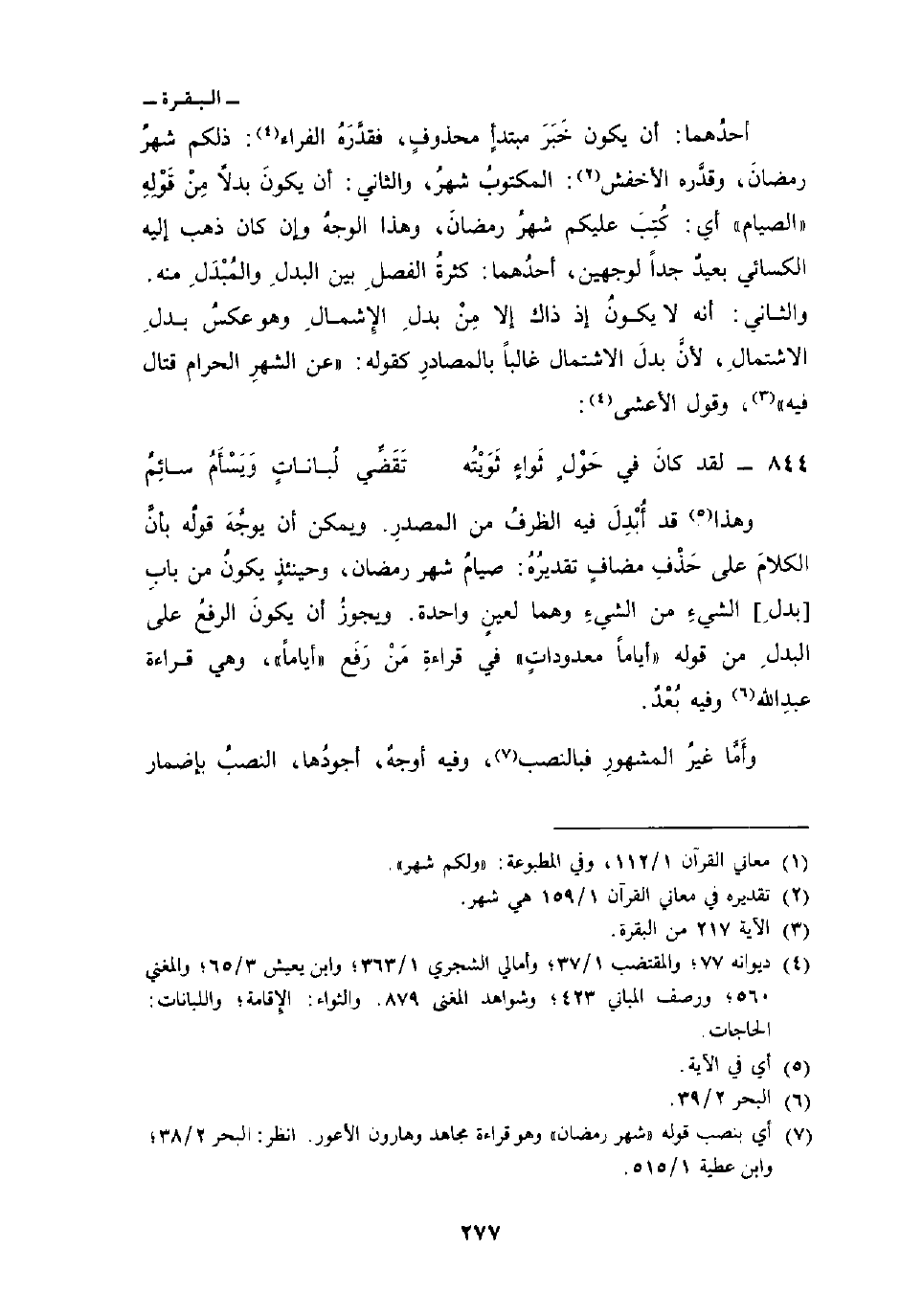 أحدُهما: أن يكون خَبَرَ مبتدأٍ محذوفٍ، فقدَّرَهُ الفراء: ذلكم شهرُ رمضانَ، وقدَّره الأخفش: المكتوبُ شهرُ، والثاني: أن يكونَ بدلاً مِنْ قَوْلِهِ «الصيام» أي: كُتِبَ عليكم شهرُ رمضانَ، وهذا الوجهُ وإن كان ذهب إليه الكسائي بعيدٌ جداً لوجهين، أحدُهما: كثرةُ الفصلِ بين البدلِ والمُبْدَلِ منه. والثاني: أنه لا يكونُ إذ ذاك إلا مِنْ بدلِ الإِشمالِ وهو عكسُ بدلِ الاشتمالِ، لأنَّ بدلَ الاشتمال غالباً بالمصادرِ كقوله: {عَنِ الشهر الحرام قِتَالٍ فِيهِ} [البقرة: 217] ، وقول الأعشى: