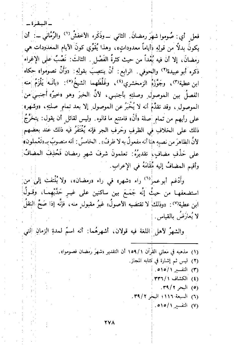وليس لقائلٍ أن يقول: يتخرَّجُ ذلك على الخلافِ في الظرفِ وحَرفِ الجر فإنه يُغْتَفَرُ فيه ذلك عند بعضهم لأنَّ الظاهرَ من نصبِهِ هنا أنه مفعولٌ به لا ظرفٌ «. الخامسُ: أنه منصوبٌ ب» تَعْملون «على حَذْفِ مضافٍ، تقديرُهُ: تعلمونَ شرفَ شهرِ رمضان فَحُذِفَ المضافُ وأقيم المضافُ إليه مُقَامَهُ في الإِعرابِ.