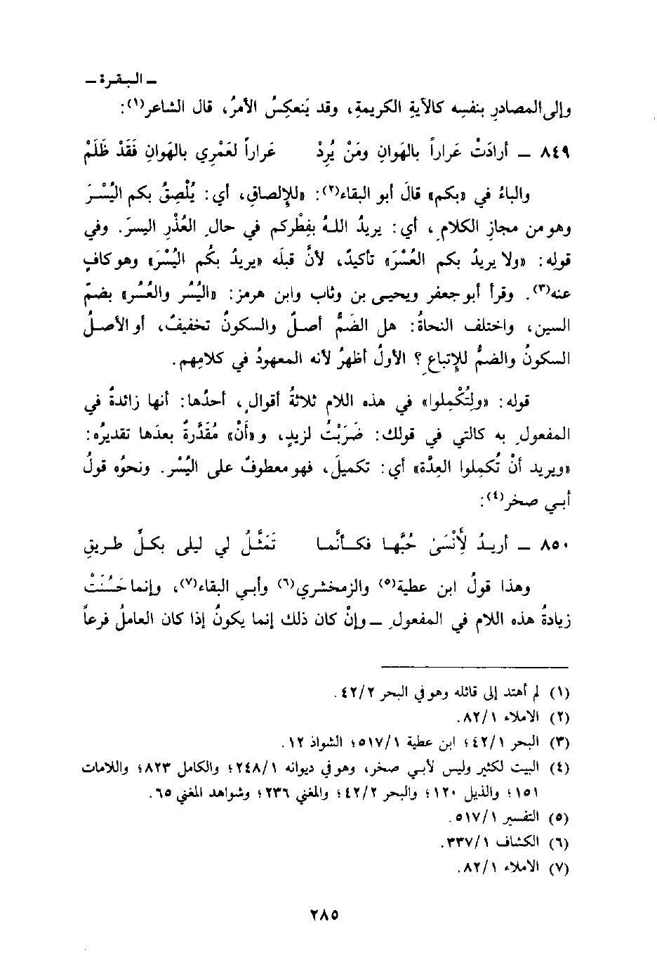 قوله: {وَلِتُكْمِلُواْ} في هذه اللام ثلاثةُ أقوالٍِ، أحدُها: أنها زائدةٌ في المفعولِ به كالتي في قولك: ضَرَبْتُ لزيدٍ، و «أَنْ» مُقَدَّرةٌ بعدَها تقديرُه: «ويريد أنْ تُكمِلوا العِدَّة» أي: تكميلَ، فهو معطوفٌ على اليُسْر. ونحوُه قولُ أبي صخر: