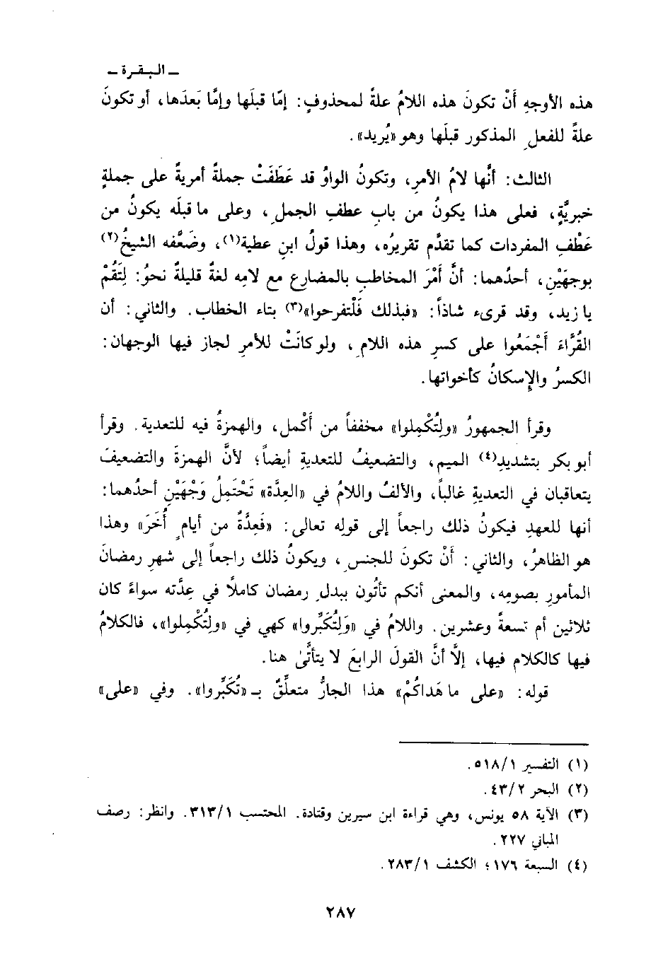 وقرأ الجمهورُ «ولِتُكْمِلوا» مخففاً من أَكْمل، والهمزةُ فيه للتعدية. وقرأ أبو بكر بتشديدِ الميم، والتضعيفُ للتعديةِ أيضاً؛ لأنَّ الهمزةَ والتضعيفَ يتعاقبان في التعديةِ غالباً، والألفُ واللامُ في «العِدَّة» تَحْتَمِلُ وَجْهَيْنِ أحدُهما: أنها للعهدِ فيكونُ ذلك راجعاً إلى قولِه تعالى: {فَعِدَّةٌ مِّنْ أَيَّامٍ أُخَرَ} وهذا هو الظاهرُ، والثاني: أَنْ تكونَ للجنسِ، ويكونُ ذلك راجعاً إلى شهرِ رمضانَ المأمورِ بصومِه، والمعنى أنكم تأتُون ببدلِ رمضان كاملاً في عِدَّته سواءً كان ثلاثين أم تسعةً وعشرين. واللامُ في «وَلِتُكَبِّروا» كهي في «ولِتُكْمِلوا» ، فالكلام فيها كالكلام فيها، إلاَّ أنَّ القولَ الربعَ لا يتأتَّى هنا.