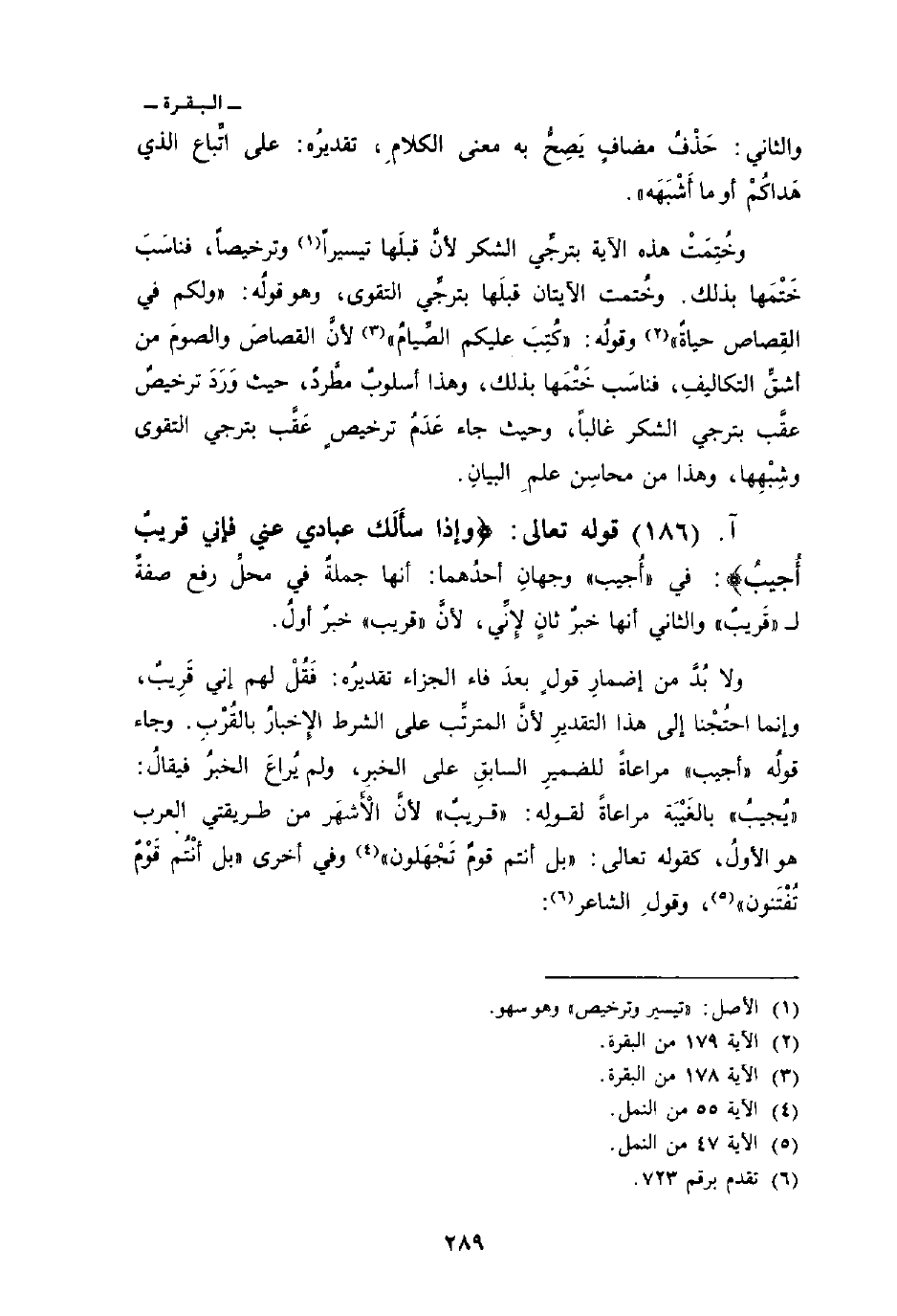 ولا بُدَّ من إضمارِ قولٍ بعدَ فاء الجزاء تقديرُه: فَقُلْ لهم إني قَرِيبٌ، وإنما احتُجْنا إلى هذا التقديرِ لأنَّ المترتِّب على الشرط الإِخبارُ بالقُرْبِ. وجاء قولُه «أجيب» مراعاةً للضميرِ السابقِ على الخبرِ، ولم يُراعَ الخبرُ فيقالُ: «يُجيبُ» بالغَيْبَة مراعاةً لقولِه: «قريبٌ» لأنَّ الأَشهَر من طريقتي العرب هو الأولُ، كقوله تعالى: {بَلْ أَنتُمْ قَوْمٌ تَجْهَلُونَ} [النمل: 55] وفي أخرى {بَلْ أَنتُمْ قَوْمٌ تُفْتَنُونَ} [النمل: 47] ، وقولِ الشاعر: