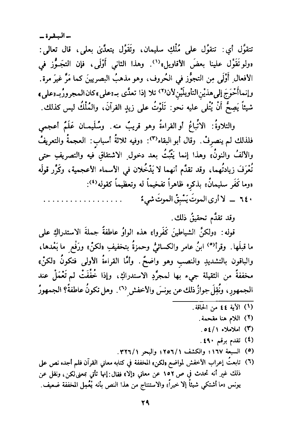تتقوَّل أي: تتقوَّل على مُلْكِ سليمان، وتَقَوَّل يتعدَّى بعلى، قال تعالى: {وَلَوْ تَقَوَّلَ عَلَيْنَا بَعْضَ الأقاويل} [الحاقة: 44] . وهذا الثاني أَوْلَى، فإن التجَوُّز في الأفعالِ أَوْلَى مِن التجوُّز في الحُروف، وهو مذهبُ البصريينَ كما مَرَّ غيرَ مرة. وإنما أَحْوَجَ إلى هذيْنِ التأويلَيْنِ لأن تلا إذا تعدَّى ب» على «كان المجرورُ ب» على «شيئاً يَصِحُّ أَنْ يُتْلى عليه نحو: تَلَوْتُ على زيدٍ القرآنَ، والمُلْكُ ليس كذلك.