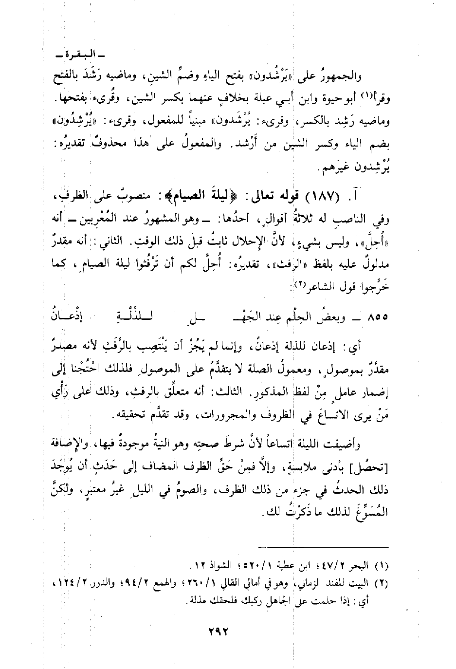 وأضيفت الليلة اتساعاً لأنَّ شرطَ صحتِه وهو النيةُ موجودةٌ فيها، والإِضافة [تحصُل] بأدنى ملابسةٍ، وإلاَّ فمِنْ حَقِّ الظرف المضاف إلى حَدَثٍ أن يُوجَدَ ذلك الحدثُ في جزء من ذلك الظرف، والصومُ في الليلِ غيرُ معتبرٍ، ولكنَّ المُسَوِّغَ لذلك ما ذَكرْتُ لك.