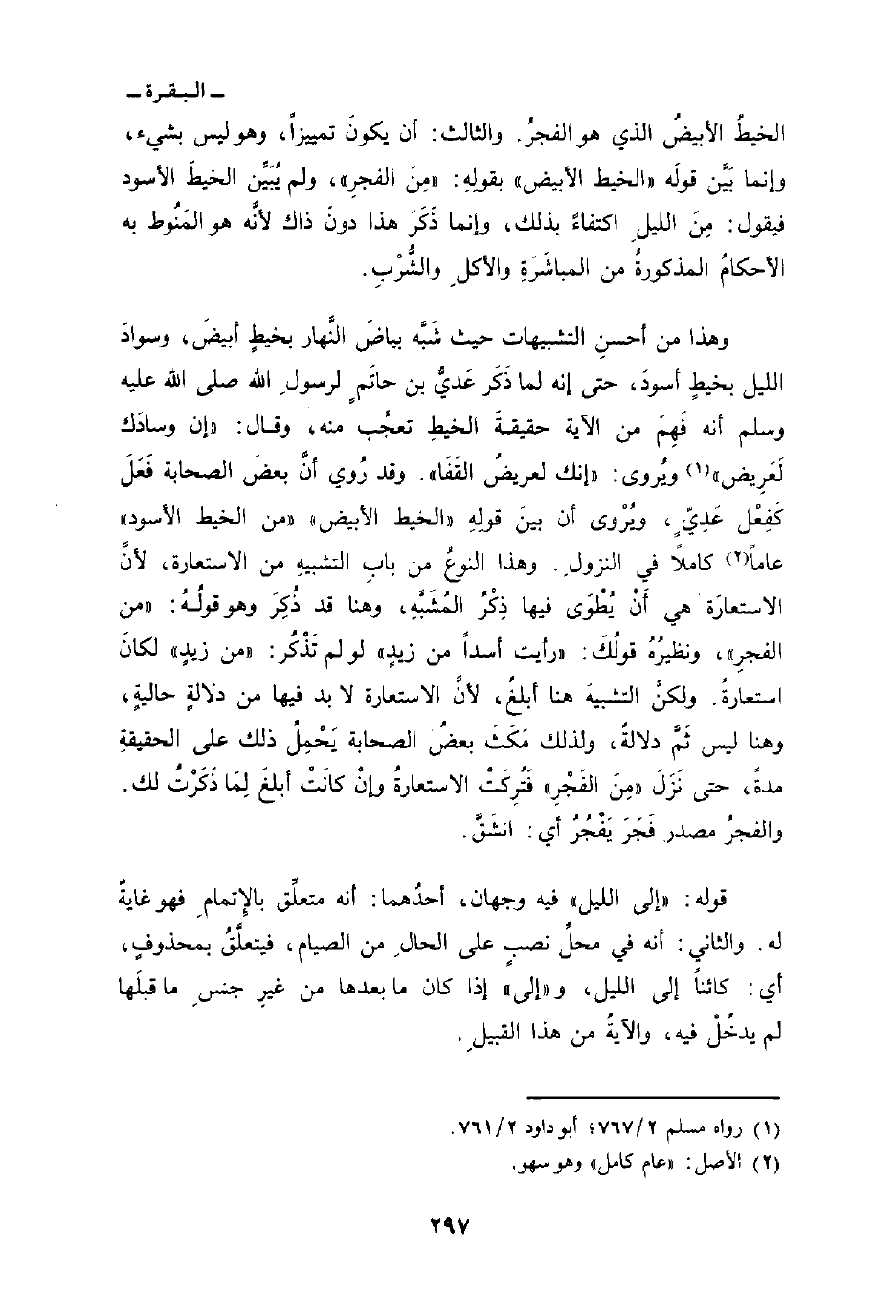 وهذا من أحسنِ التشبيهات حيث شَبَّه بياضَ النَّهار بخيطٍ أبيضَ، وسوادَ الليل بخيطٍ أسودَ، حتى إنه لما ذَكَر عَديُّ بن حاتَمٍ لرسولِ الله صَلَّى اللهُ عَلَيْهِ وَسَلَّمَ إنه فَهِمَ من الآية حقيقةَ الخيطِ تعجَّب منه، وقال: «إن وسادَك لَعَرِيض» ويُروى: «إنك لعريضُ القَفَا» وقد رُوي أنَّ بعضَ الصحابة فَعَلَ كَفِعْل عَدِيّ، ويُرْوى أن بينَ قولِهِ «الخيط الأبيض» «من الخيط الأسود» عاماً كاملاً في النزولِ. وهذا النوعُ من بابِ التشبيهِ من الاستعارة، لأنَّ الاستعارَة هي أَنْ يُطْوَى فيها ذِكْرُ المُشَبَّهِ، وهنا قد ذُكِرَ وهو قولُهُ: «من الفجر» ، ونظيرُهُ قولُكَ: «رأيت أسداً من زيدٍ» لو لم تَذْكُر: «من زيدٍ» لكانَ استعارةً. ولكنَّ التشبيهَ هنا أبلغُ، لأنَّ الاستعارة لا بد فيها من دلالةٍ حاليةٍ، وهنا ليس ثَمَّ دلالةٌ، ولذلك مَكَثَ بعضُ الصحابة يَحْمِلُ ذلك على الحقيقةِ مدةً، حتى نَزَلَ «مِنَ الفَجْرِ» فَتُرِكَتْ الاستعارة وإنْ كانَتْ أبلغَ لِمَا ذَكَرْتُ لك.