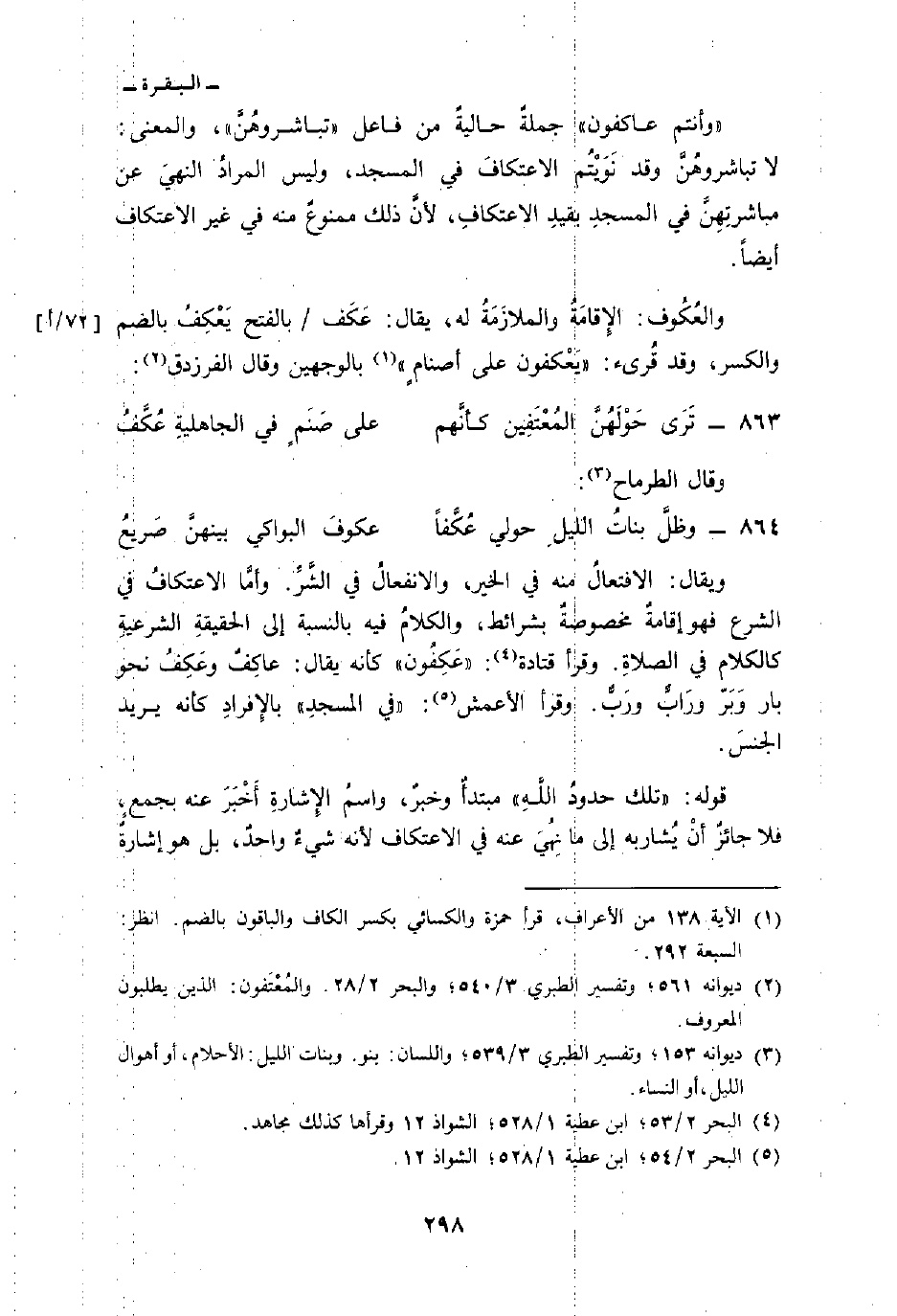 ويقال: الافتعالُ منه في الخير، والانفعالُ في الشَّرِّ. وأمَّا الاعتكافُ في الشرع فهو إقامةٌ مخصوصةٌ بشرائط، والكلامُ فيه بالنسبة إلى الحقيقةِ الشرعيةِ كالكلام في الصلاةِ. وقرأ قتادة: «عَكِفُون» كأنه يقال: عاكِفٌ وعَكِفُ نحو بار وَبَرّ ورَابٌّ ورَبٌّ. وقرأ الأعمش: «في المسجدِ» بالإِفرادِ كأنه يريد الجنسَ.