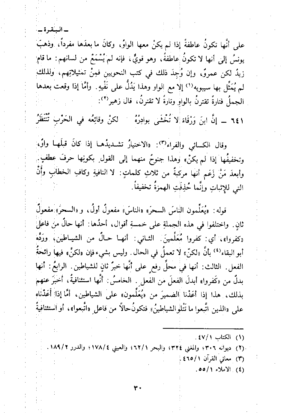 قوله: {يُعَلِّمُونَ الناس السحر} «الناسَ» مفعولٌ أولُ، و «السحرَ» مفعولٌ ثانٍ. واختلفوا في هذه الجملةِ على خمسةِ أقوال، أحدُها: أنها حالٌ من فاعل «كفروا» ، أي: كفروا مُعَلِّمينَ. الثاني: أنها حالٌ من الشياطين، ورَدَّه أبو البقاء بأنَّ «لكنّ» لا تعملُ في الحال. وليس بشيء فإن «لكنَّ» فيها رائحةُ الفعل. الثالث: أنها في محلِّ رفعٍ على أنَّها خبرٌ ثانٍ للشياطين. الرابعُ: أنها بدلٌ من «كَفروا» أبدلَ الفعلَ من الفعلِ. الخامسُ: أنَّه استئنافيةٌ، أخبرَ عنهم بذلك، هذا إذا أعَدْنا الضميرَ من «يُعَلِّمون» على الشياطين، أمَّا إذا أَعَدْناه على «الذين اتَّبعوا ما تَتْلوا الشياطينُ» فتكونُ حالاً من فاعلِ «اتَّبعوا» ، أو استئنافيةً