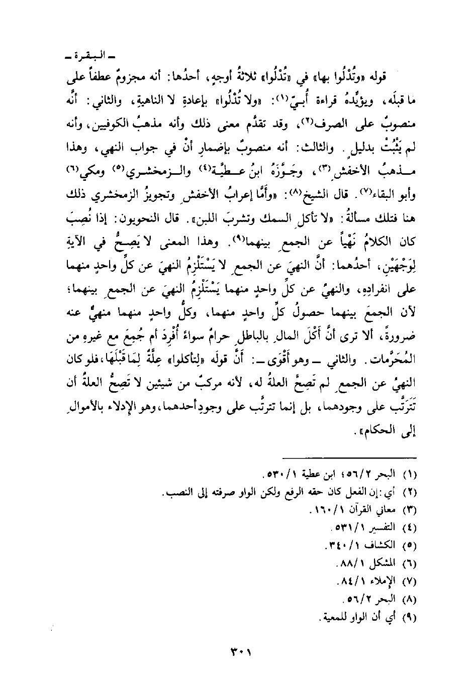 قوله {وَتُدْلُواْ بها} في «تَدْلُوا» ثلاثةُ أوجهٍ، أحدُها: أنه مجزومٌ عطفاً على ما قبلَه، ويؤيِّدهُ قراءة أُبيّ: «ولا تُدْلُوا» بإعادةِ لا الناهيةِ، والثاني: أنَّه منصوبٌ على الصرف، وقد تقدَّم معنى ذلك وأنه مذهبُ الكوفيين، وأنه لم يَثْبُتْ بدليلٍ. والثالث: أنه منصوبٌ بإضمارِ أنْ في جواب النهي، وهذا مذهبُ الأخفشِ، وجَوَّزَهُ ابنُ عطيَّة والزمخشري ومكي وأبو البقاء. قال الشيخ: «وأَمَّا إعرابُ الأخفشِ وتجويزُ الزمخشري ذلك هنا فتلك مسألةُ:» لا تأكل السمك وتشربَ اللبن «. قال النحويون: إذا نُصِبَ لِوَجْهَيْنِ، أحدُهما: أنَّ النهيَ عن الجمعِ لا يَسْتَلْزِمُ النهيَ عن كلِّ واحدٍ منهما على انفرادِهِ، والنهيُ عن كلِّ واحدٍ منهما يَسْتَلْزِمُ النهيَ عن الجمعِ بينهما؛ لأن الجمعَ بينهما حصولُ كلِّ واحدٍ منهما، وكلُّ واحدٍ منهما منهيٌّ عنه ضرورةً، ألا ترى أنَّ أَكْلَ المالِ بالباطلِ حرامٌ سواءً أُفْرِدَ أم جُمِعَ مع غيرهِ من المُحَرَّمات. والثاني - وهو أَقْوَى - أَنَّ قولَه» لِتأكلوا «عِلَّةٌ لِمَا قَبْلَهَا، فلو كان النهيُ عن الجمعِ لم تَصِحَّ العلةُ له، لأنه مركبٌ من شيئين لا تَصِحُّ العلةُ أن تَتَرتَّب على وجودهما، بل إنما تترتَّب على وجودِ أحدهما، وهو الإدلاء بالأموالِ إلى الحكام» .