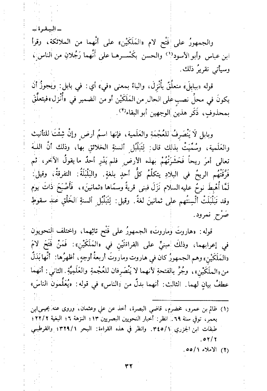قوله: {هَارُوتَ وَمَارُوتَ} الجمهورُ على فَتْح تائِهما، واختلف النحويون في إعرابهما، وذلكَ مبنيٌّ على القراءَتَيْنِ في» المَلَكَيْنِ «: فَمَنْ فَتَحَ لامَ» المَلَكَيْنِ «وهم الجمهورُ كان في هاروت وماروتَ أربعةُ أوجهٍ، أظهرُها: أنَّها بَدَلٌ من» الملَكَيْنِ «، وجُرَّ بالفتحةِ لأنهما لا يَنْصَرِفان للعُجْمةِ والعَلَمِيَّةِ. الثاني: أنهما عطفُ بيانٍ لهما. الثالث: أنهما بدلٌ من» الناس «في قوله: {يُعَلِّمُونَ الناس}