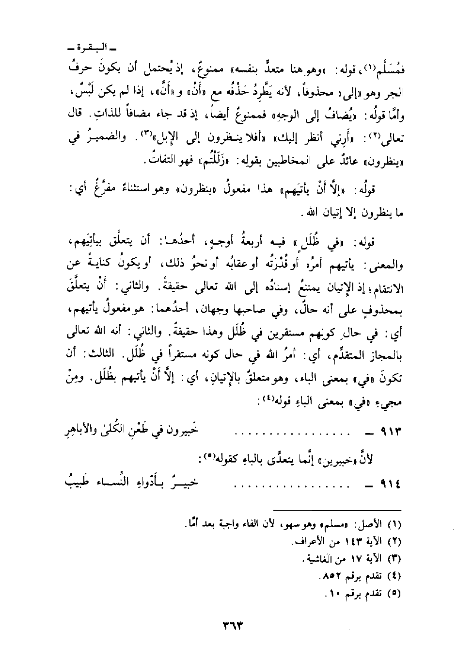 فمُسَلَّم، قوله:» وهو هنا متعدٍّ بنفسه «ممنوعٌ، إذ يُحتمل أن يكونَ حرفُ الجر وهو» إلى «محذوفاً، لأنه يَطَّرِدُ حَذْفُه مع» أَنْ «، إذا لم يكن لَبْسٌ، وأمَّا قولُه:» يُضافُ إلى الوجهِ «فممنوعٌ أيضاً، إذ قد جاء مضافاً للذاتِ. قال تعالى: {أرني أَنظُرْ إِلَيْكَ} [الأعراف: 143] {أَفَلاَ يَنظُرُونَ إِلَى الإبل} [الغاشية: 17] . والضميرُ في» ينظرون «عائدٌ على المخاطبين بقولِه:» زَلَلْتُم «فهو التفاتٌ.