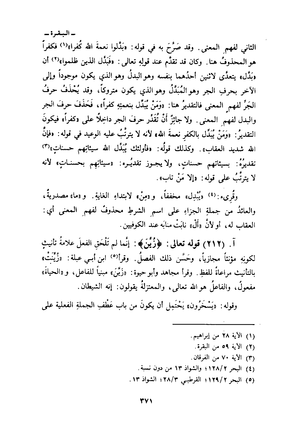 الثاني لفهمِ المعنى. وقد صَرَّح به في قوله: {بَدَّلُواْ نِعْمَةَ الله كُفْراً} [إبراهيم: 28] فكفراً هو المحذوفُ هنا. وكان قد تقدَّم عند قولِهِ تعالى: {فَبَدَّلَ الذين ظَلَمُواْ} [البقرة: 59] أن «بَدَّل» يتعدَّى لاثنين أحدُهما بنفسه وهو البدلُ وهو الذي يكون موجوداً وإلى الآخر بحرفِ الجر وهو المُبَدَّلُ وهو الذي يكون متروكاً، وقد يُحْذَفُ حرفُ الجَرِّ لفهمٍ المعنى فالتقدير هنا: «وَمَنْ يُبَدِّل بنعمتِهِ كفراً» ، فَحَذَفَ حرفَ الجر والبدل لفهمِ المعنى. ولا جائِزٌ أَنْ تُقَدِّر حرفَ الجر داخِلاً على «كفراً» فيكونَ التقديرُ: «وَمَنْ يُبَدِّل بالكفرِ نعمةَ الله» لأنه لا يترتَّبُ عليه الوعيد في قوله: {فَإِنَّ الله شَدِيدُ العقاب} . وكذلك قولُه: {فأولئك يُبَدِّلُ الله سَيِّئَاتِهِمْ حَسَنَاتٍ} [الفرقان: 70] تقديرُهُ: بسيئاتهم حسناتٍ، ولا يجوز تقديرُه: «سيئاتِهِم بحسناتٍ» لأنه لا يترتَّبُ على قوله: {إِلاَّ مَن تَابَ} .