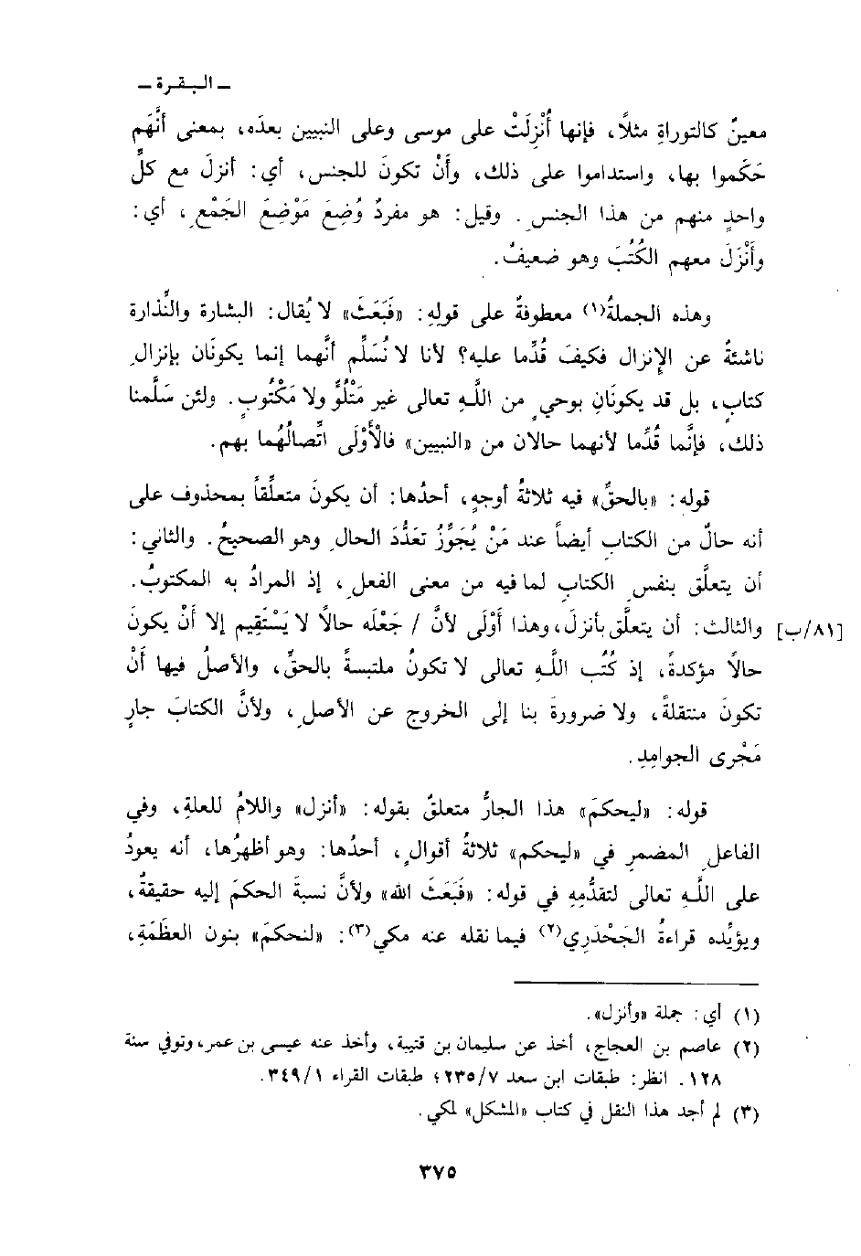 معينٌ كالتوراةِ مثلاً، فإنها أُنْزِلَتْ على موسى وعلى النبيين بعدَه، بمعنى أنَّهَم حَكَموا بها، واستداموا على ذلك، وأَنْ تكونَ للجنس، أي: أنزلَ مع كلِّ واحدٍ منهم من هذا الجنسِ. وقيل: هو مفردٌ وُضِعَ مَوْضِعَ الجَمْعِ، أي: وأَنْزَلَ معهم الكُتُبَ وهو ضعيفٌ.