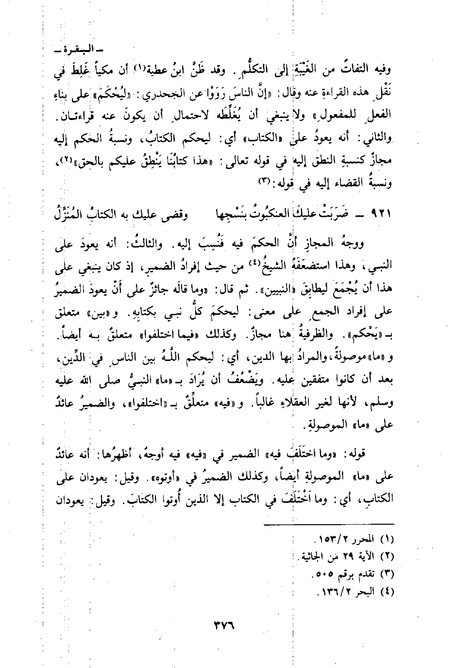 والثاني: أنه يعودُ على «الكتاب» أي: ليحكم الكتابُ، ونسبةُ الحكم إليه مجازٌ كنسبةِ النطق إليه في قوله تعالى: {هذا كِتَابُنَا يَنطِقُ عَلَيْكُم بالحق} [الجاثية: 29] ، ونسبةُ القضاء إليه في قوله: