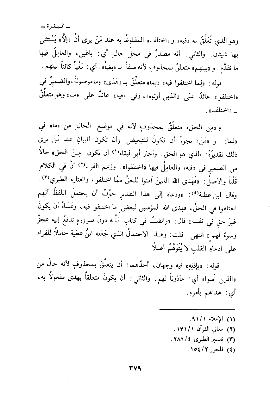 و {مِنَ الحق} متعلِّقٌ بمحذوفٍ لأنه في موضعِ الحالِ من «ما» في «لِما» . و «مَنْ» يجوزُ أن تكونَ للتبعيضِ وأن تكونَ للبيانِ عند مَنْ يرى ذلك تقديرُهُ: الذي هو الحق. وأجاز أبو البقاء أن يكونَ «مِنَ الحق» حالاً من الضميرِ في «فيه» والعامِلُ فيها «اختلفوا» . وزعم الفراء أنَّ في الكلامِ قَلْباً والأصلُ: «فَهَدى الله الذينَ آمنوا للحقِّ ممَّا اختلفوا» واختاره الطبري. وقال ابن عطية: «ودعَاه إلى هذا التقديرِ خَوْفُ أن يحتملَ اللفظُ أنهم اختلفوا في الحقِّ، فهدى الله المؤمنين لبعضِ ما اختلفوا فيه، وعَسَاهُ أن يكونَ غيرَ حقٍ في نفسِهِ» قال: «والقلبُ في كتابِ اللَّهِ دونَ ضرورةٍ تدفعُ إليه عجزٌ وسوءُ فهمٍ» انتهى. قلت: وهذا الاحتمالُ الذي جَعَلَه ابنُ عطية حاملاً للفراء على ادعاءِ القلبِ لا يُتَوَهَّمُ أصلاً.