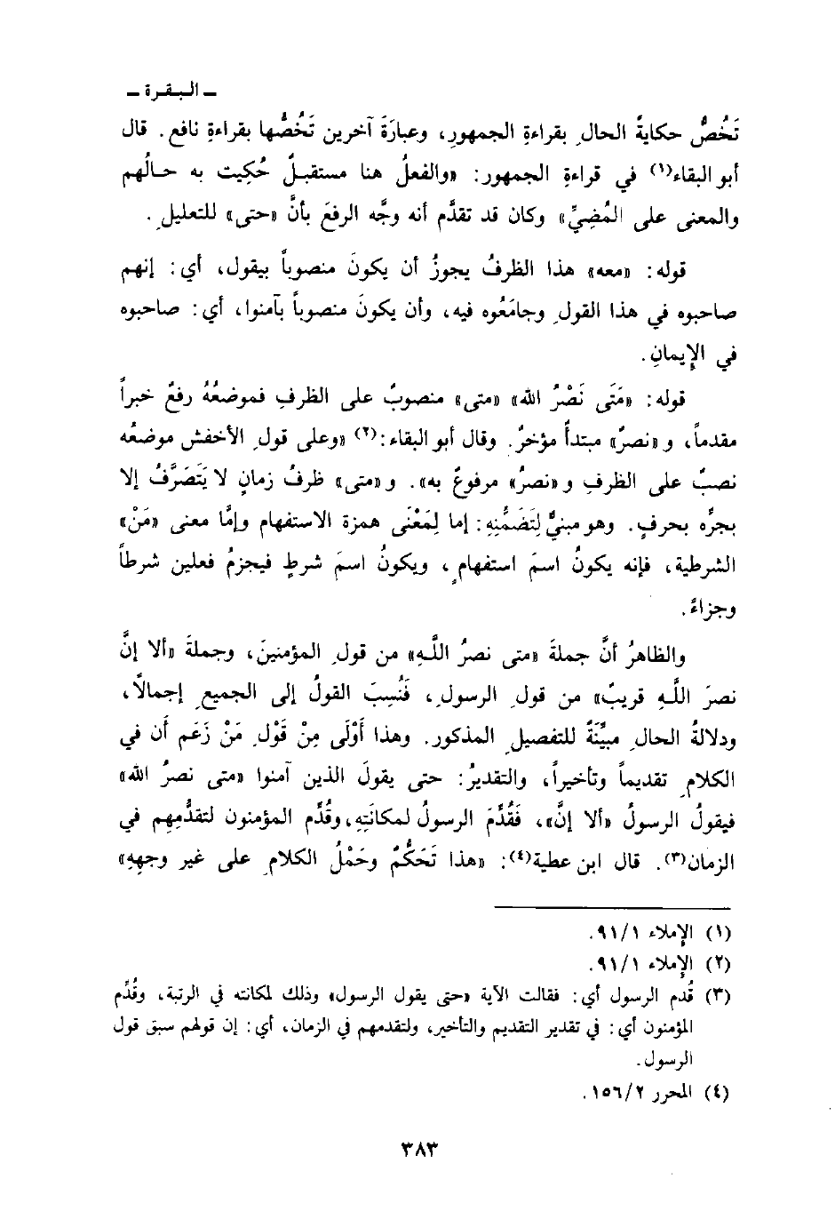 والظاهرُ أنَّ جملةَ {متى نَصْرُ الله} من قولِ المؤمنينَ، وجملةَ {ألا إِنَّ نَصْرَ الله قَرِيبٌ} من قولِ الرسولِ، فَنُسِبَ القولُ إلى الجميعِ إجمالاً، ودلالةُ الحالِ مبيِّنَةٌ للتفصيلِ المذكور. وهذا أَوْلَى مِنْ قَوْلِ مَنْ زَعَم أَن في الكلامِ تقديماً وتأخيراً، والتقديرُ: حتى يقولَ الذين آمنوا {متى نَصْرُ الله} فيقولُ الرسولُ «إلا إنَّ» ، فَقُدِّمَ الرسولُ لمكانَتِهِ، وقُدِّم المؤمنون لتقدُّمِهِم في الزمان. قال ابن عطية: «هذا تَحَكُّمٌ وحَمْلُ الكلامِ على غير وجهِهِ»