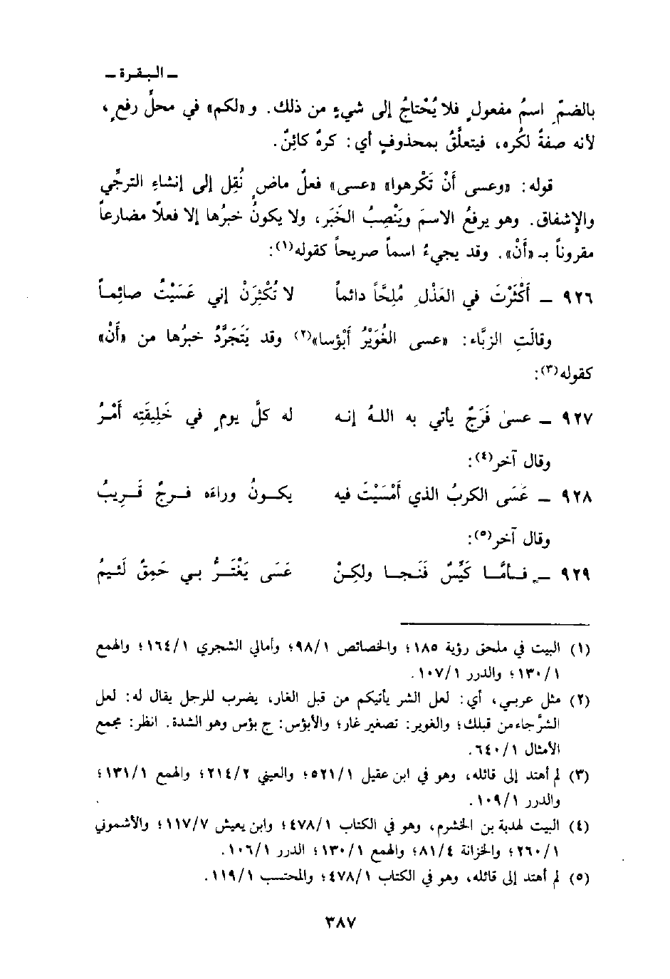 وقالَتِ الزبَّاء: «عسى الغُوَيْرُ أَبُؤسا» وقد يَتَجَرَّدُ خبرُها من «أَنْ» كقوله: