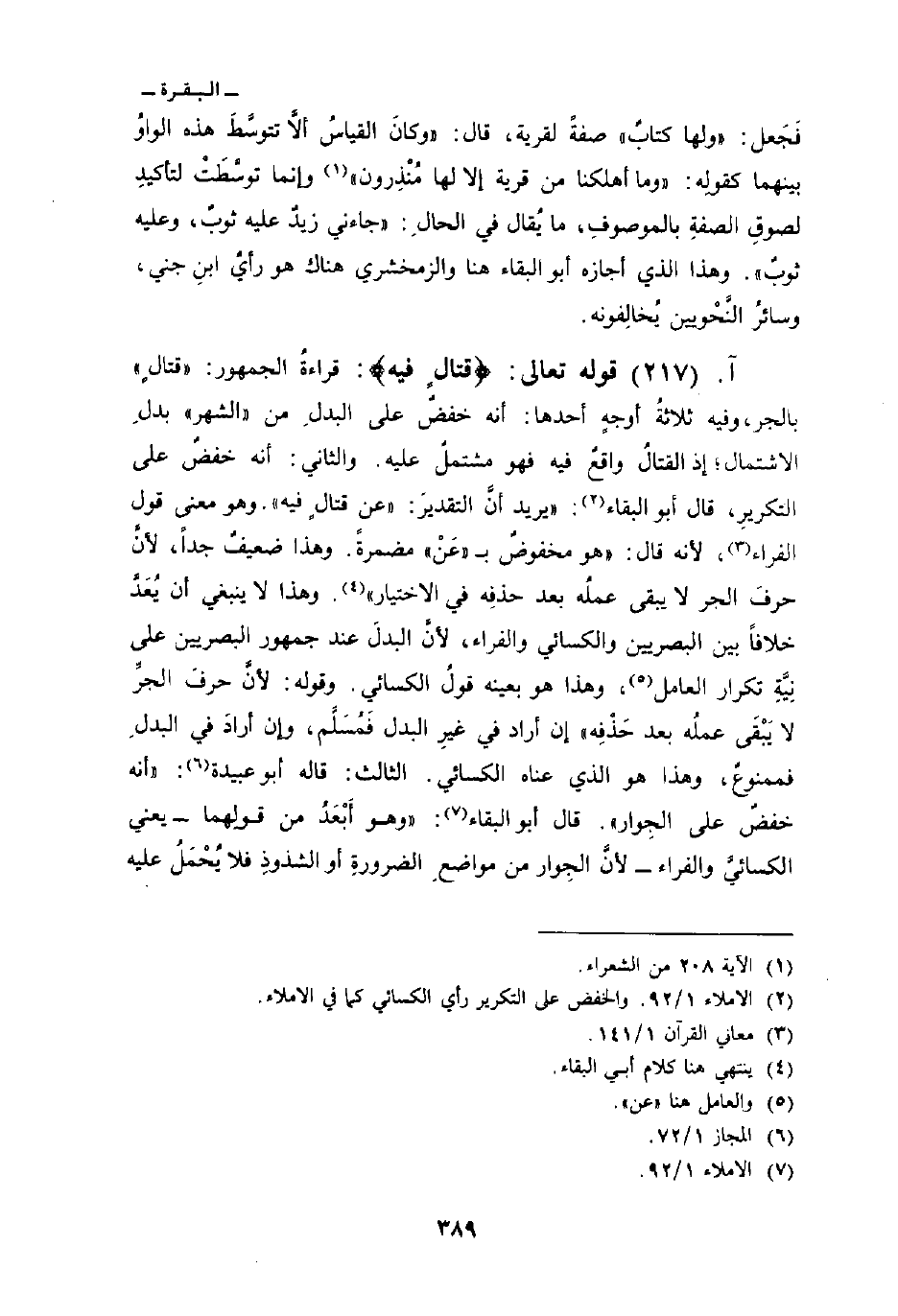 قوله تعالى: {قِتَالٍ فِيهِ} : قراءةُ الجمهور: «قتالٍ» بالجر، وفيه ثلاثةُ أوجهٍ أحدها: أنه خفضٌ على البدلِ من «الشهر» بدلِ الاشتمال؛ إذ القتالُ واقعٌ فيه فهو مشتملٌ عليه. والثاني: أنه خفضٌ على التكرير، قال أبو البقاء: «يريد أنَّ التقديرَ:» عن قتالٍ فيه «. وهو معنى قول الفراء، لأنه قال:» وهو مخفوضٌ ب «عَنْ» مضمرةً. وهذا ضعيفٌ جداً، لأنَّ حرفَ الجر لا يبقى عملُه بعد حذفِه في الاختيار «. وهذا لا ينبغي أن يُعَدَّ خلافاً بين البصريين والكسائي والفراء، لأنَّ البدلَ عند جمهور البصريين على نِيَّةِ تكرار العامل، وهذا هو بعينه قولُ الكسائي. وقوله: لأنَّ حرفَ الجرِّ لا يَبْقَى عملُه بعد حَذْفِه» إن أراد في غيرِ البدل فَمُسَلَّم، وإن أرادَ في البدلِ فممنوعٌ، وهذا هو الذي عناه الكسائي. الثالث: قاله أبو عبيدة: «أنه خفضٌ على الجِوار» . قال أبو البقاء: «وهو أَبْعَدُ من قولِهما - يعني الكسائيَّ والفراء - لأن الجِوار من مواضعِ الضرورةِ أو الشذوذِ فلا يُحْمَلُ عليه