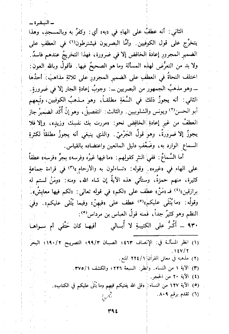 الثاني: أنه عطفٌ على الهاءِ في «به» أي: وكفرٌ به وبالمسجِد، وهذا يتخرَّج على قول الكوفيين. وأمَّا البصريون فيشترطون في العطفِ على الضميرِ المجرورِ إعادةَ الخافض إلا في ضرورة، فهذا التخريجُ عندهم فاسدٌ. ولا بد من التعرُّض لهذه المسألة وما هو الصحيحُ فيها. فأقولُ وبالله العون: اختلف النحاةُ في العطفِ على الضمير المجرورِ على ثلاثةِ مذاهبَ: أحدُها - وهو مذهبُ الجمهور من البصريين -: وجوبُ إعادةِ الجار إلا في ضرورةٍ. الثاني: أنه يجوزُ ذلك في السَّعَةِ مطلقاً، وهو مذهبُ الكوفيين، وتَبِعهم أبو الحسن ويونس والشلوبيين.