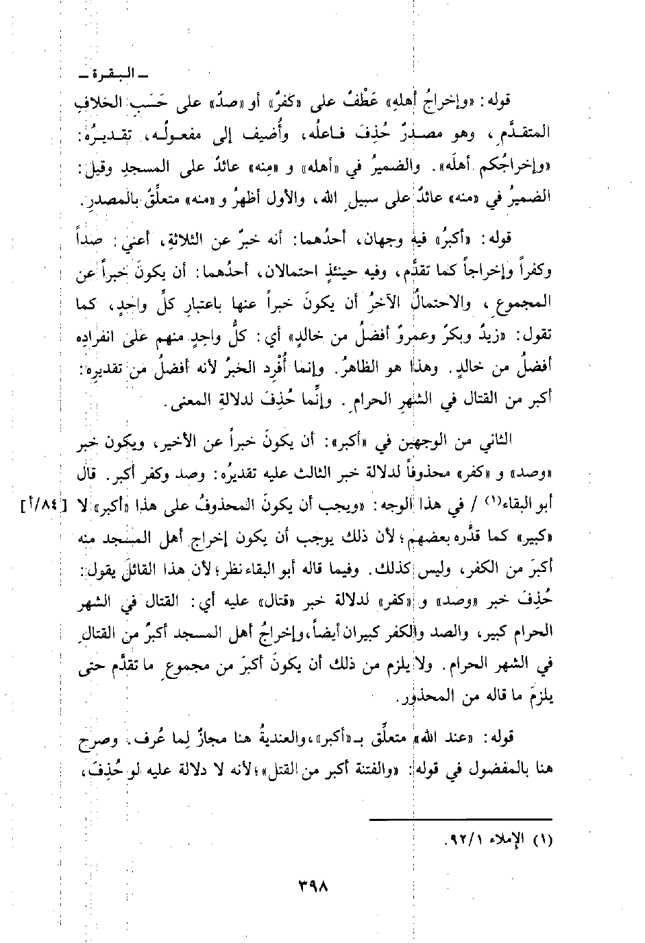الثاني من الوجهين في «أكبر» : أن يكونَ خبراً عن الأخير، ويكون خبر «وصد» و «كفر» محذوفاً لدلالة خبر الثالث عليه تقديرُه: وصد وكفر أكبر. قال أبو البقاء/ في هذا الوجه: «ويجب أن يكونَ المحذوفُ على هذا» أكبر «لا» «كبير» كما قدَّره بعضهم؛ لأن ذلك يوجب أن يكون إخراج أهل المسجد منه حُذِفَ خبر «وصد» و «كفر» لدلالة خبر «قتال» عليه أي: القتال في الشهر الحرام كبير، والصد والكفر كبيران أيضاً، وإخراجُ أهل المسجد أكبرُ من القتالِ في الشهر الحرام.