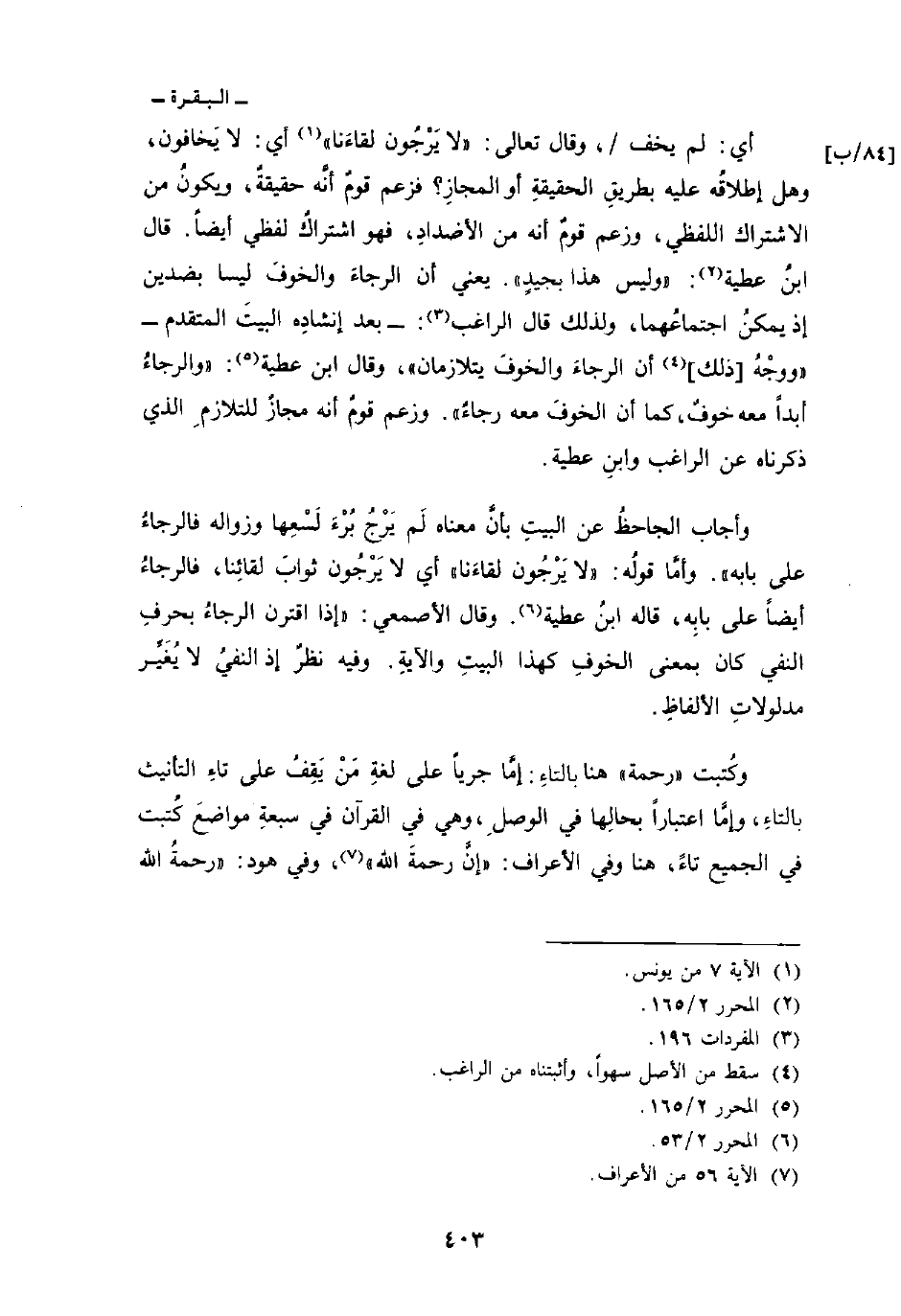أي: لم يخف/، وقال تعالى: {لاَ يَرْجُونَ لِقَآءَنَا} [يونس: 7] أي: لا يَخافون، وهل إطلاقُه عليه بطريقِ الحقيقةِ أو المجازِ؟ فزعم قومٌ أنَّه حقيقةٌ، ويكونُ من الاشتراك اللفظي، وزعم قومٌ أنه من الأضدادِ، فهو اشتراكٌ لفظي أيضاً. قال ابنُ عطية:» وليس هذا بجيدٍ «. يعني أن الرجاء والخوفَ ليسا بضدين إذ يمكنُ اجتماعُهما، ولذلك قال الراغب: - بعد إنشادِه البيتَ المتقدم -» ووجْهُ [ذلك] أن الرجاءَ والخوفَ يتلازمان «، وقال ابن عطية:» والرجاءُ أبداً معه خوفٌ، كما أن الخوفَ معه رجاءٌ «. وزعم قومٌ أنه مجازٌ للتلازمِ الذي ذكرناه عن الراغب وابنِ عطية.