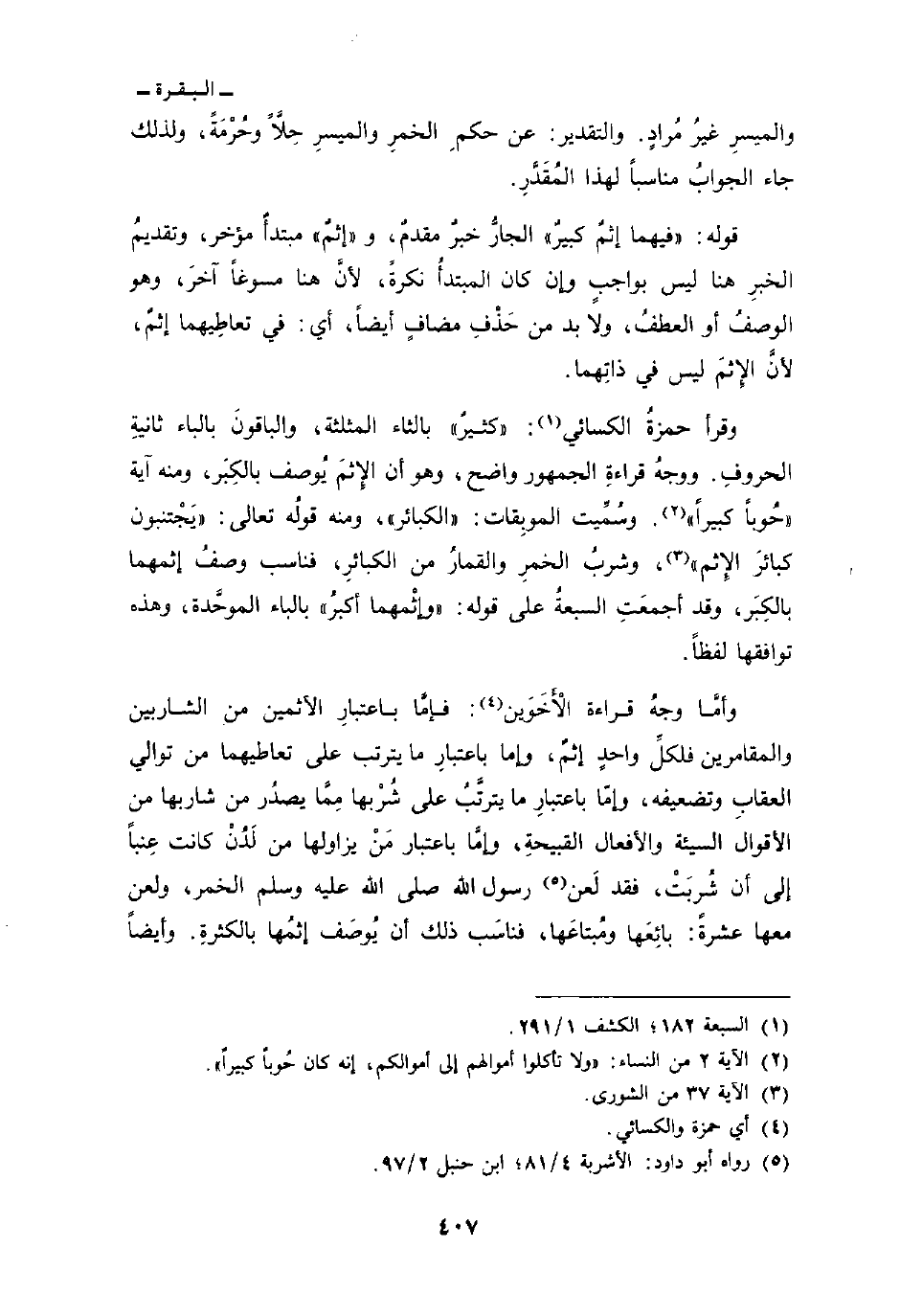 وقرأ حمزةُ الكسائي: «كثيرٌ» بالثاء المثلثة، والباقونَ بالباء ثانيةِ الحروفِ. ووجهُ قراءةِ الجمهور واضح، وهو أن الإِثمَ يُوصف بالكِبرَ، ومنه آية {حُوباً كَبِيراً} [النساء: 2] . وسُمِّيت الموبِقات: «الكبائر» ، ومنه قولُه تعالى: {يَجْتَنِبُونَ كَبَائِرَ الإثم} [الشورى: 37] ، وشربُ الخمرِ والقمارُ من الكبائرِ، فناسب وصفُ إثمهما بالكِبَر، وقد أجمعَتِ السبعةُ على قوله: «وإثْمهما أكبرُ» بالباء الموحَّدة، وهذه توافقها لفظاً.