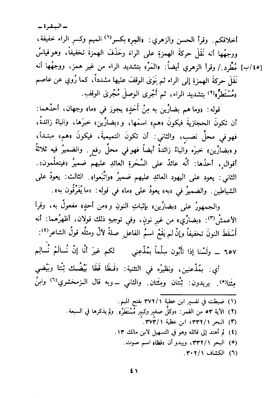 والجمهورُ على «بضارِّين» بإثباتِ النونِ و «من أحدٍ» مفعولٌ به، وقرأ الأعمشُ: «بضارِّي» من غيرِ نونٍ، وفي توجيهِ ذلك قولان، أظهرُهما: أنه أَسْقَطَ النونَ تخفيفاً وإنْ لم يَقَعْ اسمُ الفاعلِ صلةً لألْ ومثلُه قولُ الشاعر: