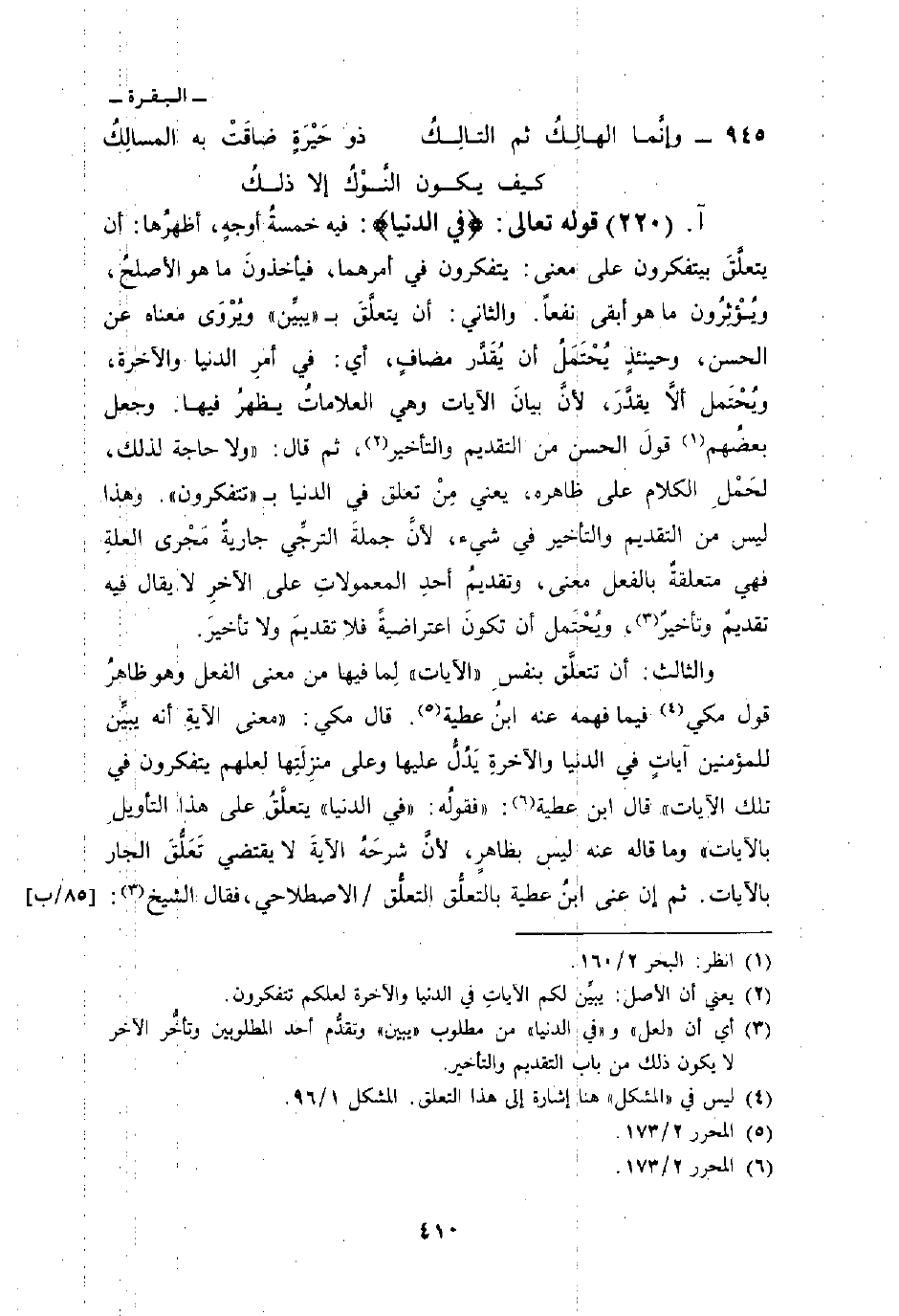 قوله تعالى: {فِي الدنيا} : فيه خمسةُ أوجهٍ، أظهرُها: أن يتعلَّقَ بيتفكرون على معنى يتفكرون في أمرهما، فيأخذونَ ما هو الأصلحُ، ويُؤْثِرُون ما هو أبقى نفعاً. والثاني: أن يتعلَّقَ ب «يبيِّن» ويُرْوَى معناه عن الحسن، وحينئذٍ يُحْتَمَلُ أن يُقَدَّر مضافٍ، أي: في أمرِ الدنيا والآخرة، ويُحْتَمل ألاَّ يقدَّرَ، لأنَّ بيانَ الآيات وهي العلاماتُ يظهرُ فيها. وجعل بعضُهم قولَ الحسن من التقديم والتأخير، ثم قال: «ولا حاجة لذلك، لحَمْلِ الكلام على ظاهره، يعني مِنْ تعلق في الدنيا ب» تتفكرون «. وهذا ليس من التقديم والتأخير في شيء، لأنَّ جملةَ الترجِّي جاريةٌ مَجْرى العلةِ فهي متعلقةٌ بالفعل معنى، وتقديمُ أحدِ المعمولاتِ على الآخرِ لا يقال فيه تقديمٌ وتأخيرٌ، ويُحْتَمل أن تكونَ اعتراضيةً فلا تقديمَ ولا تأخيرَ.