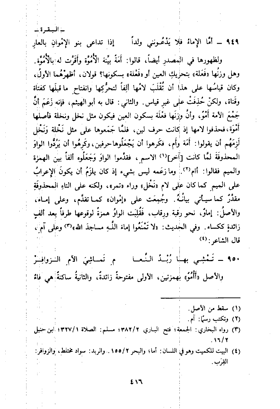 والثاني: قال به أبو الهيثم، فإنه زَعَمَ أنَّ جَمْعَ الأمة أَمْوٌ، وأنَّ وزنَها فعْلَة بسكون العين فيكون مثل نخل ونخلة فأصلها أَمْوَة، فحذفوا لامها إذ كانت حرف لين، فلمَّا جَمَعوها على مثل نَخْلة ونَخْل لَزِمَهُم أن يقولوا: أَمَة وأَم، فكَرهوا أن يَجْعَلُوها حرفين، وكَرِهُوا أن يَرُدُّوا الواوَ المحذوفَةَ لمَّا كانت [آخر] الاسمِ، فقدَّموا الواوَ وَجَعَلُوا ألفاً بين الهمزة والميم فقالوا: أام. وما زعَمه ليس بشيء إذ كان يلزَمُ أن يكونَ الإِعرابُ على الميمِ كما كان على لام «نَخْل» وراء «تمر» ، ولكنه على التاءِ المحذوفَةِ مقدَّرٌ كما سيأتي بيانُهُ. وجُمِعَت على «إمْوان» كما تقدَّم، وعلى إماء، والأصلُ: إماؤٌ، نحو رقبة ورِقاب، فَقُلِبَت الواوُ همزةً لوقوعها طرفاً بعد ألفٍ زائدةٍ ككساء. وفي الحديث: «لا تَمْنَعُوا إماءَ اللَّهِ مساجدَ الله» وعلى آمِ، قال الشاعر: