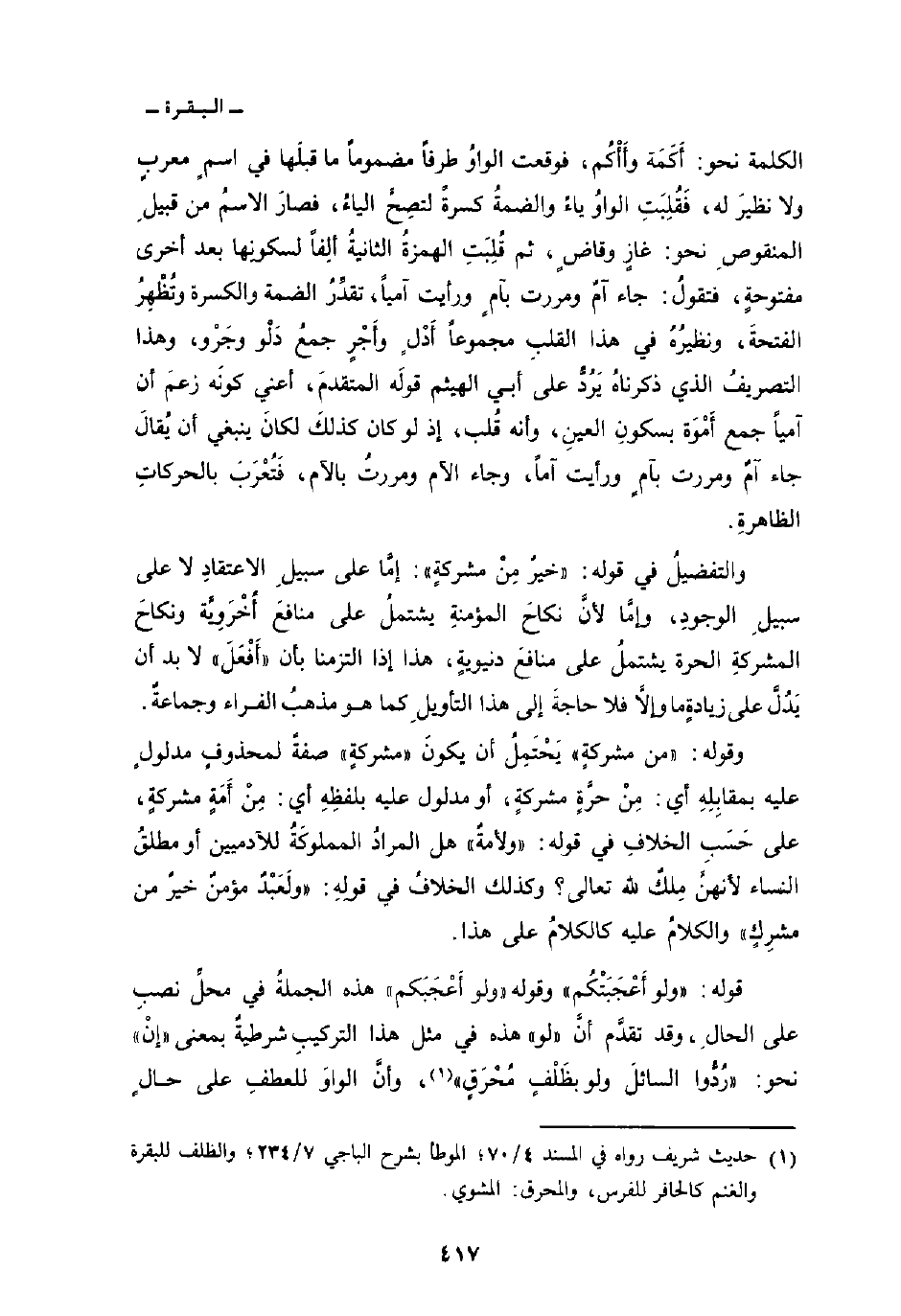 وقوله: {مِّن مُّشْرِكَةٍ} يَحْتَمِلُ أن يكونَ «مشركةٍ» صفةً لمحذوفٍ مدلولٍ عليه مقابِلِهِ أي: مِنْ حرَّةٍ مشركةٍ، أو مدلول عليه بلفظِهِ أي: مِنْ أَمَةٍ مشركةٍ، على حَسَبِ الخلافِ في قوله: «ولأمةٌ» هل المرادُ المملوكَةُ للآدميين أو مطلقُ النساء لأنهنَّ مِلكٌ لله تعالى؟ وكذلك الخلافُ في قولِهِ: {وَلَعَبْدٌ مُّؤْمِنٌ خَيْرٌ مِّن مُّشْرِكٍ} والكلامُ عليه كالكلامُ على هذا.