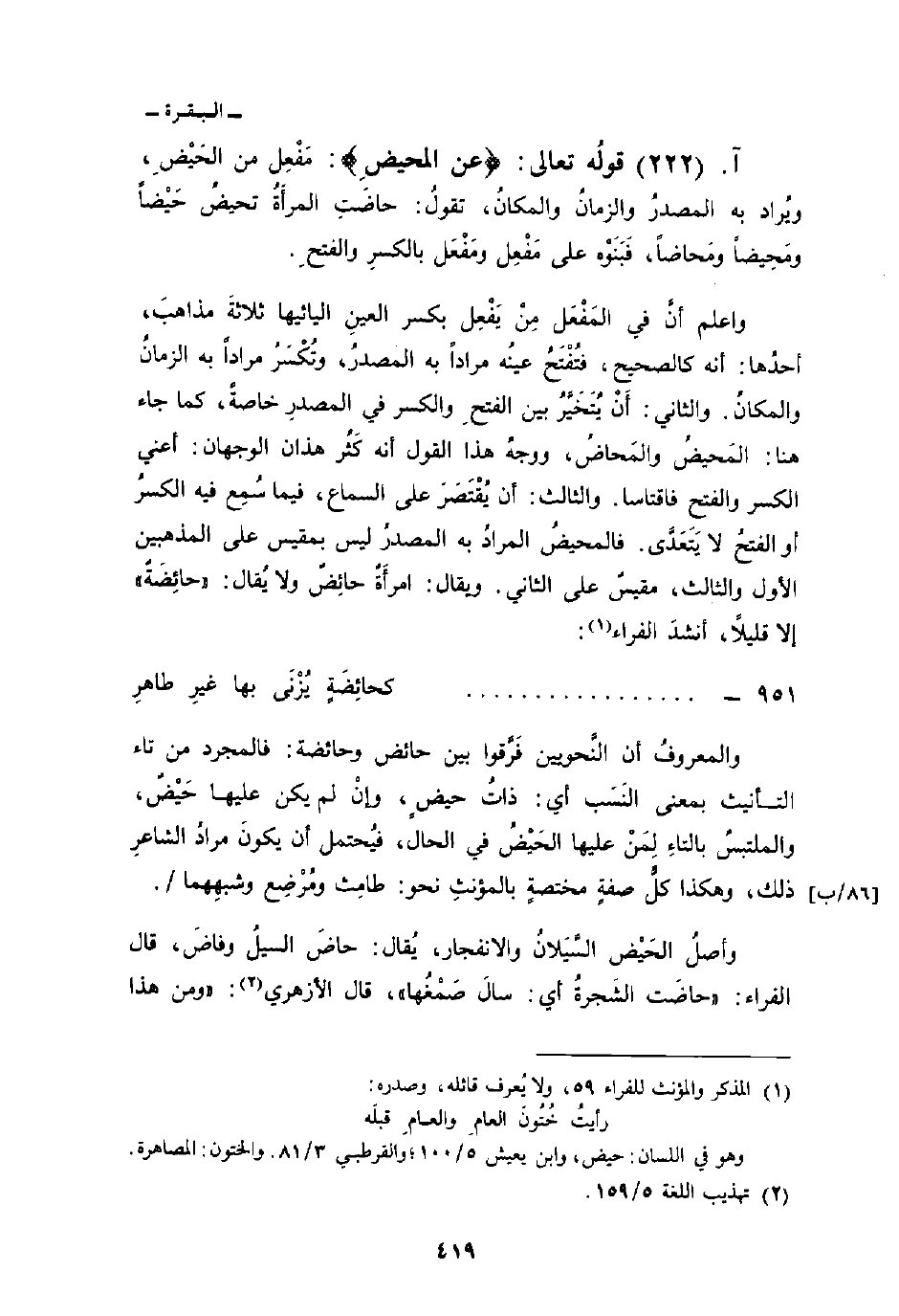 واعلم أنَّ في المَفْعَل مِنْ يَفْعِل بكسر العينِ اليائيها ثلاثةَ مذاهبَ، أحدُها: أنه كالصحيح، فتُفْتَحُ عينُه مراداً به المصدرُ، وتُكْسَرُ مراداً به الزمانُ والمكانُ. والثاني: أَنْ يُتَخَيَّرُ بين الفتحِ والكسر في المصدرِ خاصةً، كما جاء هنا: المَحيضُ والمَحاضُ، ووجهُ هذا القول أنه كَثُر هذان الوجهان: أعني الكسر والفتح فاقتاسا. والثالث: أن يُقْتَصَرَ على السماع، فيما سُمِع فيه الكسرُ أو الفتحُ لا يَتَعَدَّى. فالمحيضُ المرادُ به المصدرُ ليس بمقيس على المذهبين الأول والثالث، مقيسٌ على الثاني. ويقال: امرأَةٌ حائِضٌ ولا يُقال: «حائِضَةٌ» إلا قليلاً، أنشدَ الفراء: