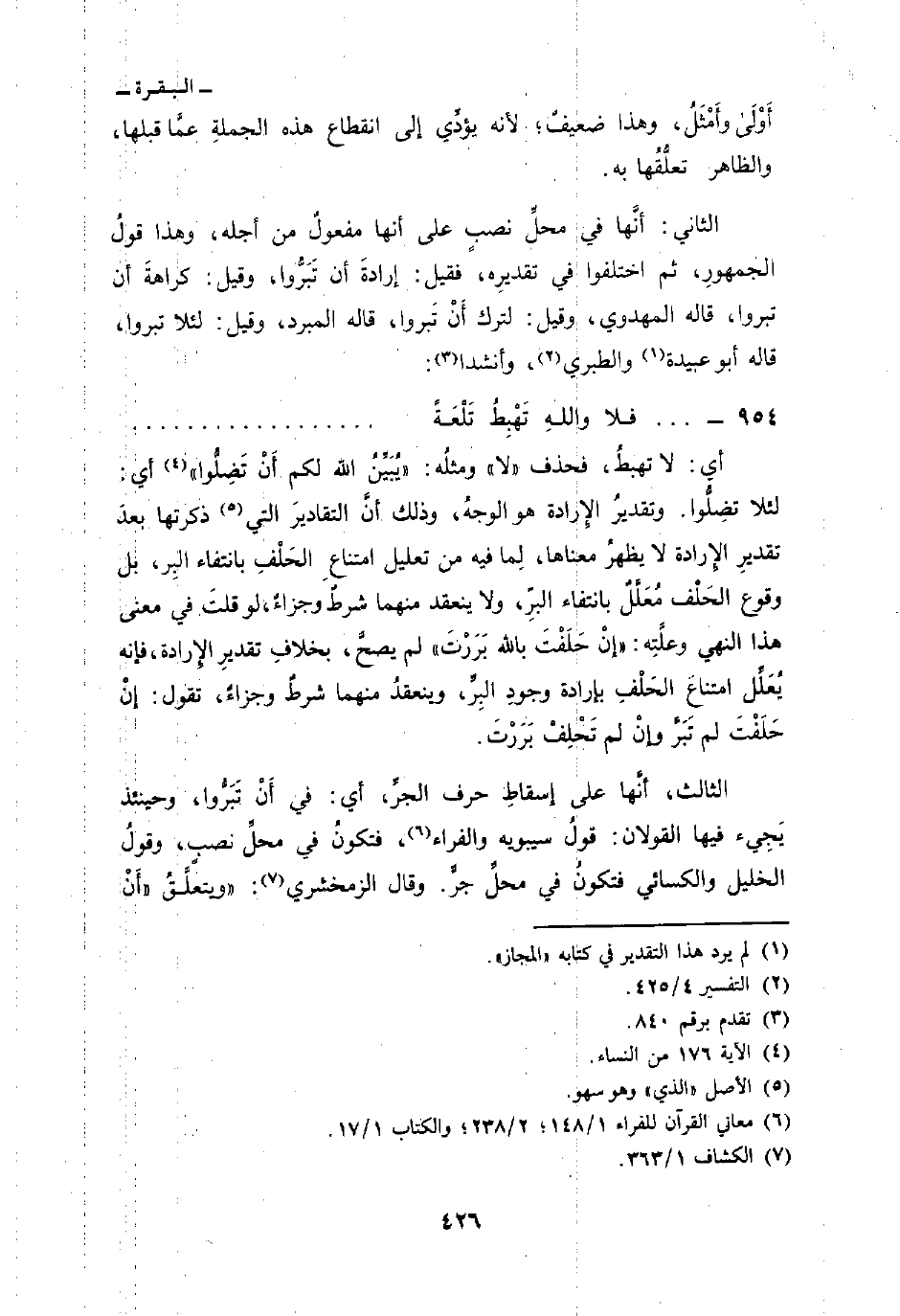 954 -. . . فلا واللهِ تَهْبِطُ تَلْعَةً. . . . . . . . . . . . . . . . . . . . . . . . . ... أي: لا تهبطُ، فحذف «لا» ومثله: {يُبَيِّنُ الله لَكُمْ أَن تَضِلُّواْ} [النساء: 176] أي: لئلا تضِلُّوا. وتقديرُ الإِرادة هو الوجهُ، وذلك أنَّ التقاديرَ التي ذكرتها بعدَ تقديرِ الإِرادة لا يظهرُ معناها، لِما فيه من تعليل امتناعِ الحَلْفِ بانتفاء البِر، بل وقوع الحَلْف مُعَلَّلٌ بانتفاء البِرِّ، ولا ينعقد منهما شرطٌ وجزاءٌ، لو قلتَ في معنى هذا النهي وعلَّتِه: «إنْ حَلَفْتَ بالله بَرَرْتَ» لم يصحَّ، بخلافِ تقديرِ الإِرادة، فإنه يُعَلِّل امتناعَ الحَلْفِ بإرادة وجودِ البِرِّ، وينعقدُ منهما شرطٌ وجزاءٌ، تقول: إنْ حَلَفْتَ لم تَبَرَّ وإنْ لم تَحْلِفْ بَرَرْتَ.