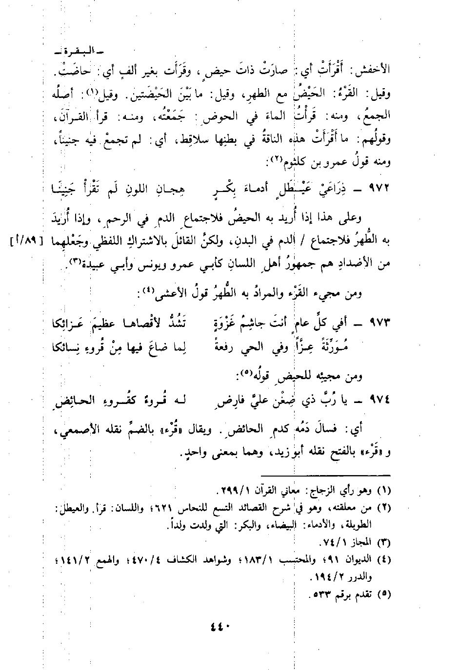 الأخفش: أَقْرَأَتْ أي: صارَتْ ذاتَ حيضٍ، وقَرَأَت بغير ألفٍ أي: حاضَتْ. وقيل: القَرْءُ: الحَيْضُ مع الطهرِ، وقيل: ما بَيْنَ الحَيْضَتين. وقيل: أصلُه الجمعُ، ومنه: قَرأْتُ الماءَ في الحوضِ: جَمَعْتُه، ومنه: قرأ القرآنَ: وقولُهم: ما أَقْرَأَتْ هذه الناقةُ في بطنِها سلاقِط، أي: لم تجمعْ فيه جنيناً، ومنه قولُ عمرو بن كلثوم: