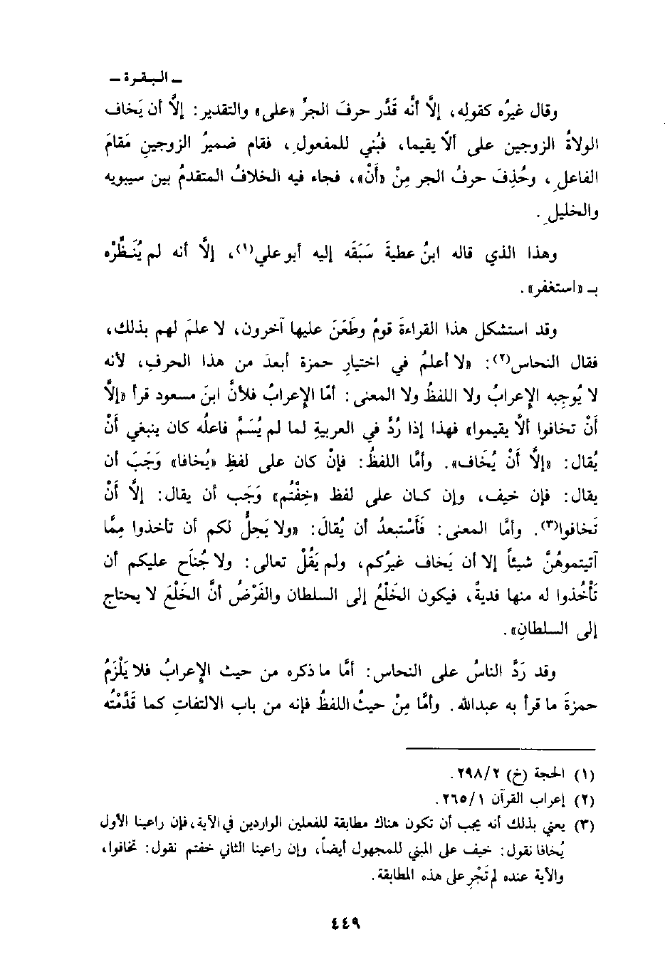 وقد استشكل هذا القراءةَ قومٌ وطَعَنَ عليها آخرون، لا علمَ لهم بذلك، فقال النحاس: «لا أعلمُ في اختيارِ حمزة أبعدَ من هذا الحرفِ، لأنه لا يُوجِبه الإِعرابُ ولا اللفظُ ولا المعنى: أمّا الإِعرابُ فلأنَّ ابنَ مسعود قرأ {إلاَّ أَنْ تخافوا ألاَّ يقيموا} فهذا إذا رُدَّ في العربيةِ لما لم يُسَمَّ فاعلُه كان ينبغي أَنْ يُقال: {إلاَّ أَنْ يُخاف} . وأمَّا اللفظُ: فإنْ كان على لفظِ» يُخافا «وَجَبَ أَنْ يقال: فإن خيف، وإن كان على لفظ» خِفْتُم «وَجَب أن يقال: إلاَّ أَنْ تَخافوا. وأمَّا المعنى: فَأَسْتبعدُ أن يُقالَ:» ولا يَحِلُّ لكم أن تأخذوا مِمَّا آتيتموهُنَّ شيئاً إلا أن يَخاف غيرُكم، ولم يَقُلْ تعالى: ولا جُنَاح عليكم أن تَأْخُذوا له منها فديةً، فيكون الخَلْعُ إلى السلطان والفَرْضُ أنَّ الخَلْعَ لا يحتاج إلى السلطانِ «.