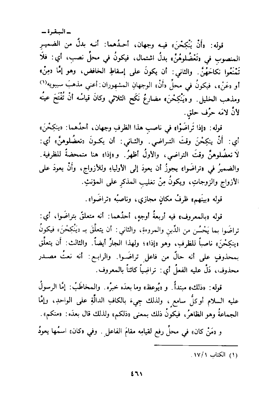 قوله: {أَن يَنكِحْنَ} فيه وجهان: أحدُهما: أنه بدلٌ من الضمير المنصوبِ في «تَعْضُلوهُنَّ» بدلُ اشتمال، فيكونُ في محلِّ نصبِ، أي: فلاَ تَمْنَعُوا نكاحَهُنَّ. والثاني: أن يكونَ على إسقاطِ الخافض، وهو إمَّا «مِنْ» أو «عَنْ» ، فيكونُ في محلِّ «أَنْ» الوجهانِ المشهوران: أعني مذهبَ سيبويه ومذهب الخليل. و «يَنْكِحْنَ» مضارعُ نَكَح الثلاثي وكانَ قياسُه أنْ تُفْتَحَ عينُه لأنَّ لامَه حرُف حلقٍ.