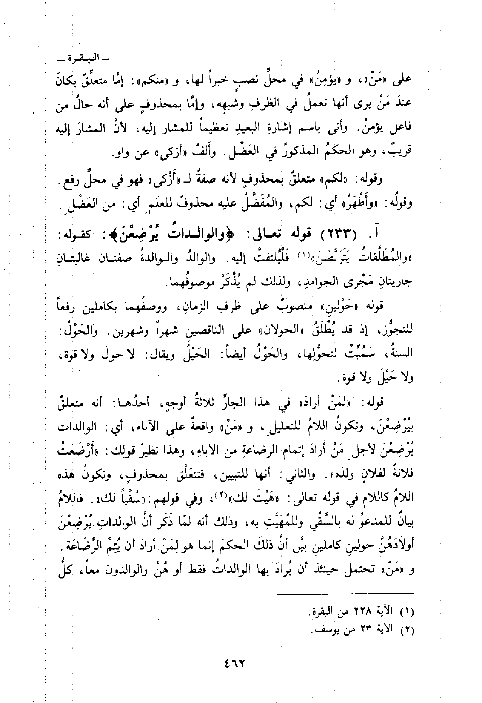 قوله: {لِمَنْ أَرَادَ} في هذا الجارِّ ثلاثةُ أوجهٍ، أحدُها: أنه متعلقٌ بيُرْضِعْنَ، وتكونُ اللامُ للتعليلِ، و «مَنْ» واقعةٌ على الآباء، أي: الوالدات يُرْضِعْنَ لأجلِ مَنْ أَرادَ إتمام الرضاعةِ من الآباءِ، وهذا نظيرٌ قولِك: «أَرْضَعَتْ فلانةٌ لفلانٍ ولدَه» . والثاني: أنها للتبيين، فتتعَلَّق بمحذوفٍ، وتكونُ هذه اللامُ كاللام في قوله تعالى: {هَيْتَ لَكَ} [يوسف: 23] ، وفي قولهم: «سُقْياً لك» . فاللامُ بيانٌ للمدعوِّ له بالسَّقْي وللمُهَيَّتِ به، وذلك أنه لمّا ذَكَر أنَّ الوالداتِ يُرْضِعْنَ أولاَدَهُنَّ حولينِ كاملينِ بيَّن أنَّ ذلكَ الحكمَ إنما هو لِمَنْ أرادَ أن يُتِمَّ الرَّضَاعَة. و «مَنْ» تحتمل حينئذ أن يُرادَ بها الوالداتُ فقط أو هُنَّ والوالدون معاً. كلُّ