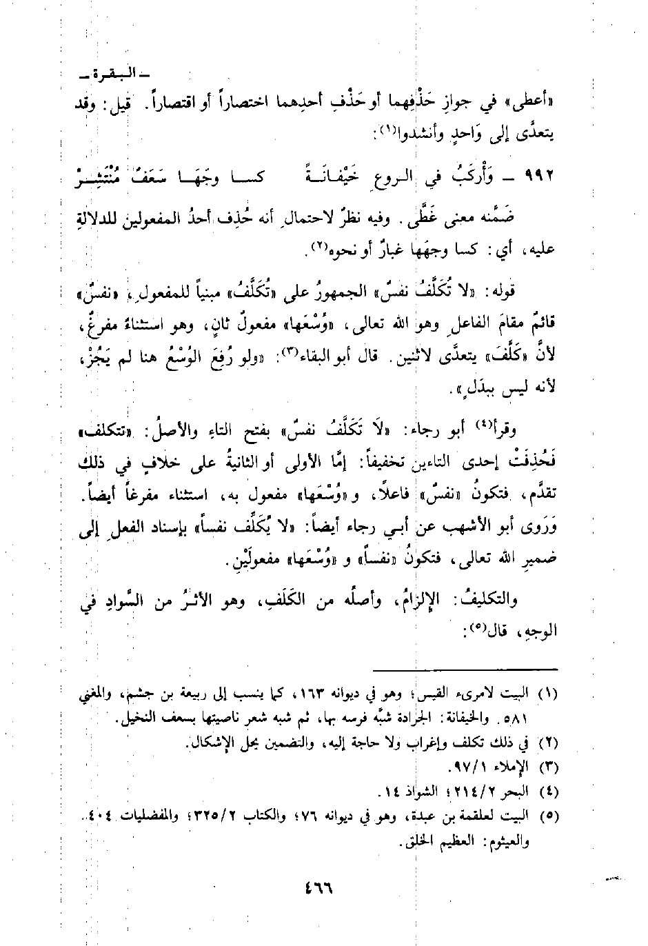 قوله: {لاَ تُكَلَّفُ نَفْسٌ} الجمهورُ على «تُكَلَّفُ» مبنياً للمفعولِ، «نفسٌ» قائمٌ مقامَ الفاعلِ وهو الله تعالى، «وُسْعَها» مفعولٌ ثانٍ، وهو استثناءٌ مفرغٌ، لأنَّ «كَلَّفَ» يتعدَّى لاثنين. قال أبو البقاء: «ولو رُفِعَ الوُسْعُ هنا لم يَجُزْ لأنه ليس ببدَلٍ» .