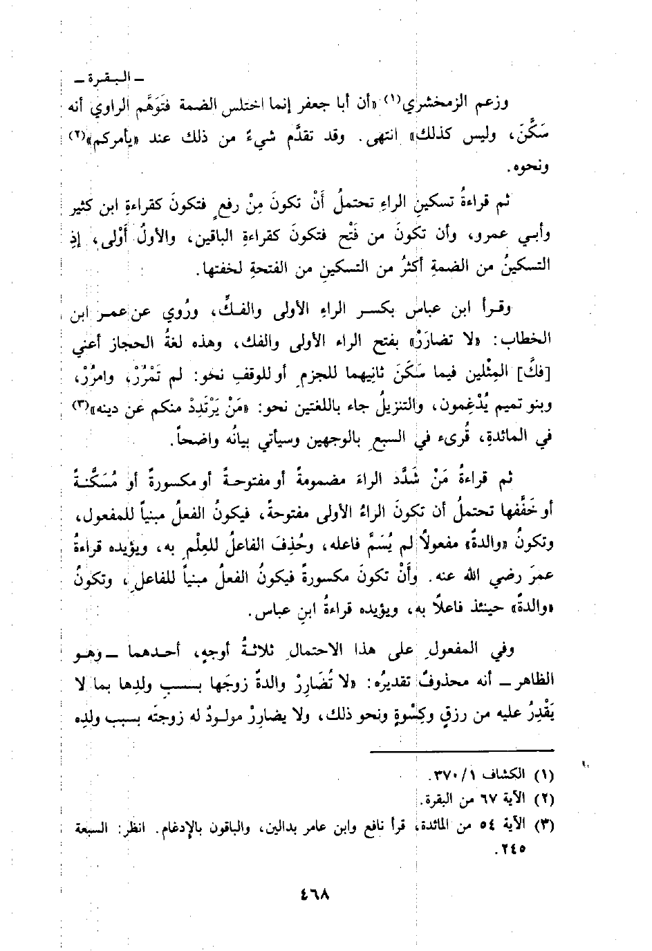 وقرأ ابن عباس بكسر الراءِ الأولى والفكِّ، ورُوي عن عمر ابن الخطاب: «لا تضارَرْ» بفتح الراء الأولى والفك، وهذه لغةُ الحجاز أعني [فكَّ] المِثْلين فيما سَكَنَ ثانيهما للجزمِ أو للوقفِ نحو: لم تَمْرُرْ، وامرُرْ، وبنو تميم يُدْغِمون، والتنزيلُ جاء باللغتين نحو: {وَمَن يَرْتَدِدْ مِنْكُمْ عَن دِينِهِ} [المائدة: 54] في المائدةِ، قُرىء في السبعِ بالوجهين وسيأتي بيانُه واضحاً.
