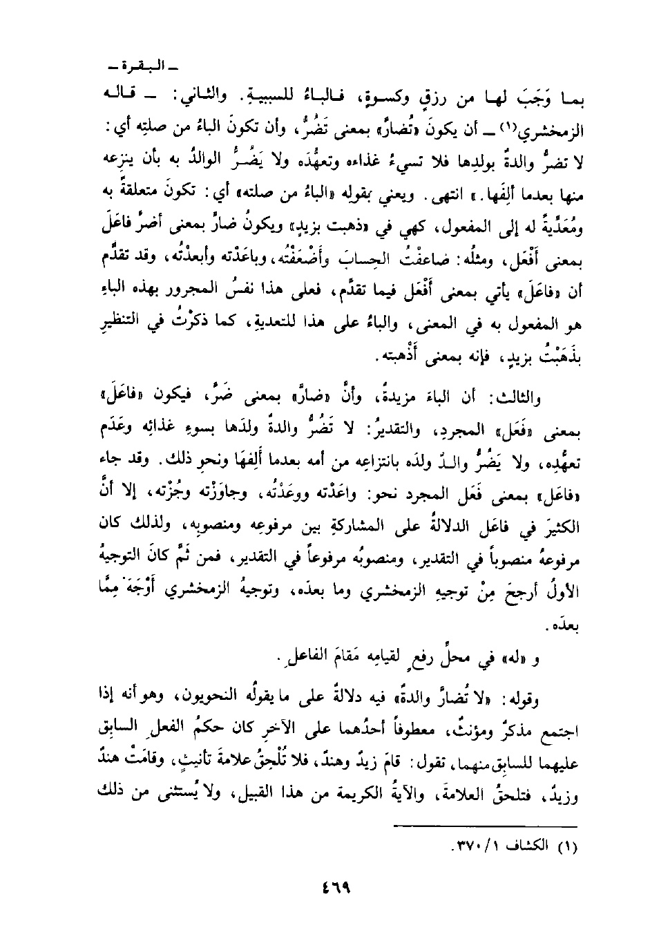 والثالث: أن الباءَ مزيدةٌ، وأنَّ «ضارَّ» بمعنى ضَرَّ، فيكون «فاعَلَ» بمعنى «فعَلَ» المجردِ، والتقديرُ: لا تَضُرُّ والدةٌ ولدَها بسوءِ غذائِه وعَدَم تعهُّدِه، ولا يَضُرُّ والدٌ ولدَه بانتزاعِه من أمه بعدما أَلِفهَا ونحوِ ذلك. وقد جاء «فاعَل» بمعنى فَعَل المجرد نحو: واعَدْته ووعَدْتُه، وجاوَزْته وجُزْته، إلا أنَّ الكثيرَ في فاعَل الدلالةُ على المشاركةِ بين مرفوعِه ومنصوبِه، ولذلك كان مرفوعهُ منصوباً في التقدير، ومنصوبُه مرفوعاً في التقدير، فمن ثَمَّ كانَ التوجيهُ الأولُ أرجحَ مِنْ توجيهِ الزمخشري وما بعدَه، وتوجيهُ الزمخشري أَوْجَهَ مِمَّا بعدَه.