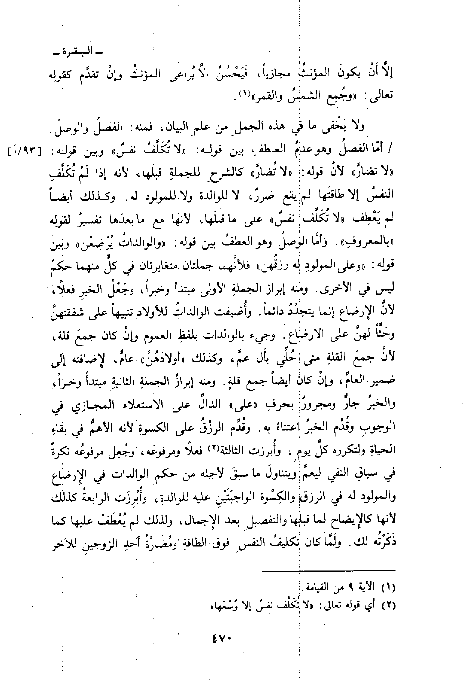ولا يَخْفى ما في هذه الجملِ من علمِ البيان، فمنه: الفصلُ والوصلُ/ أمَّا الفصلُ وهو عدمُ العطفِ بين قولِه: {لاَ تُكَلَّفُ نَفْسٌ} وبين قوله: «لا تضارَّ» لأنَّ قوله: «لا تُضارَّ» كالشرحِ للجملةِ قبَلها، لأنه إذا لَمْ تُكَلَّفِ النفسُ إلا طاقَتَها لم يقع ضررٌ، لا للوالدة ولا للمولود له. وكذلك أيضاً لم يَعْطِف {لاَ تُكَلَّفُ نَفْسٌ} على ما قبلَها، لأنها مع ما بعدَها تفسيرٌ لقوله «بالمعروفِ» . وأمَّا الوصلُ وهو العطفُ بين قوله: «والوالداتُ يُرْضِعْنَ» وبين قولِه: «وعلى المولودِ له رزقُهن» فلأنَّهما جملتان متغايرتان في كلٍّ منهما حكمٌ ليس في الأخرى. ومنه إبراز الجملةِ الأولى مبتدأ وخبراً، وجَعْلُ الخبرِ فعلاً، لأنَّ الإِرضاع إنما يتجدَّدُ دائماً. وأُضيفت الوالداتُ للأولاد تنبيهاً على شفقتهنَّ وحَثَّاً لهنَّ على الارضاع. وجيء بالوالدات بلفظِ العموم وإنْ كان جمعَ قلة، لأنَّ جمعَ القلةِ متى حُلِّي بأَل عمَّ، وكذلك «أولادَهُنَّ» عامٌّ، لإِضافته إلى ضمير العامِّ، وإنْ كان أيضاً جمع قلةٍ. ومنه إبرازُ الجملةِ الثانيةِ مبتدأً وخبراً، والخبرُ جارٌّ ومجرورٌ بحرفِ «على» الدالِّ على الاستعلاء المجازي في الوجوبِ وقُدِّم الخبرُ اعتناءً به. وقُدِّم الرزْقُ على الكسوةِ لأنه الأهمُّ في بقاءِ الحياةِ ولتكرره كلَّ يومٍ. وأُبرزت الثالثة فعلاً ومرفوعَه، وجُعِل مرفوعُه نكرةً في سياقِ النفي ليعمَّ ويتناولَ ما سبقَ لأجله من حكم الوالدات في الإِرضاع والمولود له في الرزق والكِسْوة الواجبَتَيْنِ عليه للوالدةِ، وأُبْرِزَت الرابعةُ كذلك لأنها كالإِيضاح لما قبلها والتفصيلِ بعد الإِجمال، ولذلك لم يُعْطَفْ عليها كما ذَكَرْتُه لك.