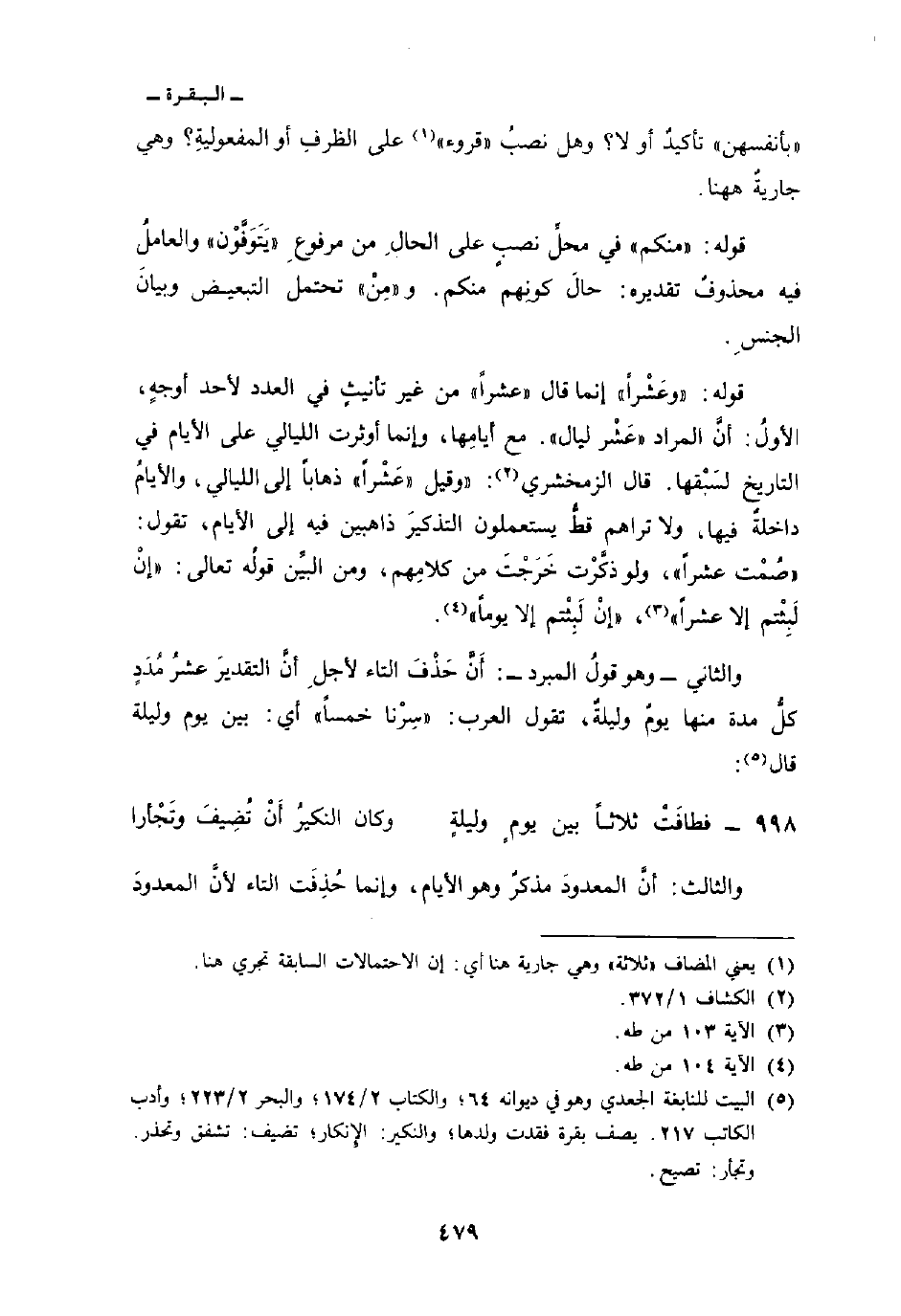 والثاني - وهو قولُ المبرد -: أَنَّ حَذْف التاء لأجلِ أنَّ التقديرَ عشرُ مُدَدٍ كلُّ مدة منها يومٌ وليلةٌ، تقول العرب:» سِرْنا خمساً «أي: بين يوم وليلة قال: