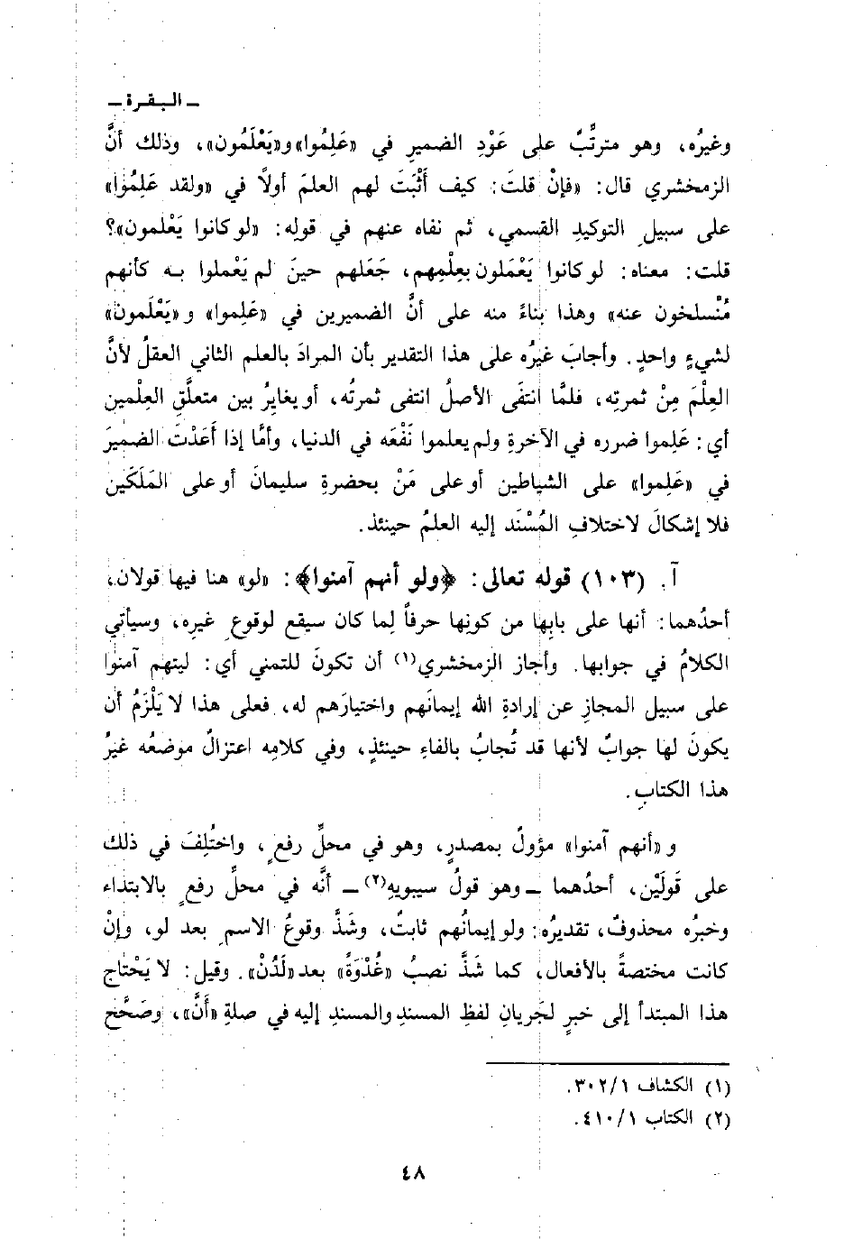 وغيرُه، وهو مترتِّبٌ على عَوْدِ الضميرِ في «عَلِمُوا» و «يَعْلَمُون» ، وذلك أنَّ الزمخشري قال: «فإنْ قلتَ: كيف أَثْبَتَ لهم العلمَ أولاَّ في» ولقد عَلِمُوا «على سبيلِ التوكيد القسمي، ثم نفاه عنهم في قولِه: {لَوْ كَانُواْ يَعْلَمُونَ} ؟ قلت: معناه: لو كانوا يَعْمَلون بعِلْمِهم، جَعَلهم حينَ لم يَعْلَموا به كأنهم مُنْسلخون عنه» وهذا بناءً منه على أنَّ الضميرين في «عَلِموا» و «يَعْلَمون» لشيءٍ واحدٍ. وأجابَ غيرُه على هذا التقدير بأن المرادَ بالعلم الثاني العقلُ لأنَّ العِلْمَ مِنْ ثمرتِه، فلمَّا انتفَى الأصلُ انتفى ثمرتُه، أو يغايِرُ بين متعلَّقِ العِلْمين أي: عَلِموا ضرره في الآخرةِ ولم يعلموا نَفْعَه في الدنيا، وأمَّا إذا أَعَدْتَ الضميرَ في «عَلِموا» على الشياطين أو على مَنْ بحضرةِ سليمانَ أو على المَلَكَين فلا إشكالَ لاختلافِ المُسْنَد إليه العلمُ حينئذ.