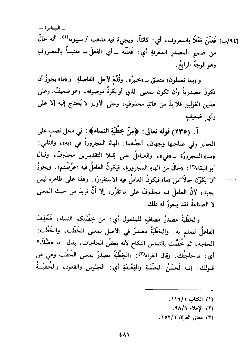 قوله تعالى: {مِنْ خِطْبَةِ النسآء} : في محل نصبٍ على الحالِ وفي صاحبها وجهان، أحدُهما: الهاءُ المجرورةُ في «به» ، والثاني: «ما» المجرورُة ب «في» ، والعاملُ على كِلا التقديرين محذوفٌ، وقال أبو البقاء: «حالٌ من الهاءِ المجرورةِ، فيكونُ العاملُ فيه» عَرَّضْتم «. ويجوزُ أن يكونَ حالاً من» ما «فيكونُ العاملُ فيه الاستقرارَ» . وهذا على ظاهره ليس بجيد، لأنَّ العاملَ فيه محذوفٌ على ما تقرَّر، إلا أَنْ تريدَ من حيث المعنى لا الصناعةُ فقد يجوزُ له ذلك.